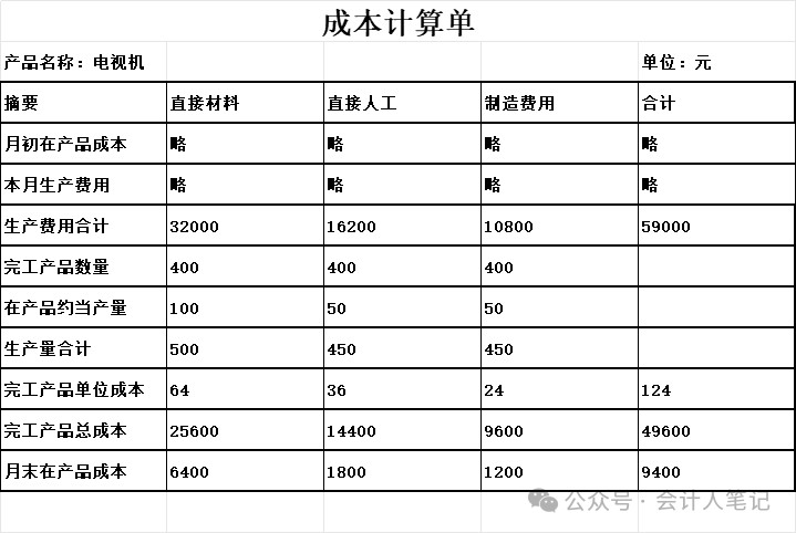 例:牛馬企業(yè)生產(chǎn)電視機(jī),本月完工400件,月末在產(chǎn)品100件,在產(chǎn)品的完工程度為50%;本月電視機(jī)生產(chǎn)成本明細(xì)賬中所列月初在產(chǎn)品成本和本月生產(chǎn)費(fèi)用共計(jì)59000元,其中直接材料費(fèi)用32000元,直接人工16200元,制造費(fèi)用10800元。原材料系生產(chǎn)開始時(shí)一次投入。 分配材料費(fèi)用 月末在產(chǎn)品約當(dāng)產(chǎn)量=100×100%=100(件) 原材料費(fèi)用分配率=32000÷(400+100)=64(元/件) 完工產(chǎn)品應(yīng)負(fù)擔(dān)原材料費(fèi)用=400×64=25600(元) 月末在產(chǎn)品應(yīng)負(fù)擔(dān)原材料費(fèi)用=100×64=6400(元) 分配人工費(fèi)用 月末在產(chǎn)品約當(dāng)產(chǎn)量=100×50%=50(件) 直接人工分配率=16200÷(400+50)=36(元/件) 完工產(chǎn)品應(yīng)負(fù)擔(dān)直接人工費(fèi)用=400×36=14400(元) 在產(chǎn)品應(yīng)負(fù)擔(dān)直接人工費(fèi)用=50×36=1800(元) 分配制造費(fèi)用 制造費(fèi)用分配率=10800÷(400+50)=24(元/件) 完工產(chǎn)品應(yīng)負(fù)擔(dān)制造費(fèi)用=400×24=9600(元) 在產(chǎn)品應(yīng)負(fù)擔(dān)制造費(fèi)用=50×24=1200(元) 計(jì)算完工產(chǎn)品成本和月末在產(chǎn)品成本 A產(chǎn)品的完工成本=25600+14400+9600=49600(元) 月末在產(chǎn)品成本=6400+1800+1200=9400(元) ![]() 四、約當(dāng)產(chǎn)量法小結(jié):三步走,穩(wěn)準(zhǔn)算掌握了完工產(chǎn)品和在產(chǎn)品的成本分配方法,尤其是約當(dāng)產(chǎn)量法這個(gè) “利器”,咱們制造業(yè)成本會(huì)計(jì)在成本核算的戰(zhàn)場(chǎng)上就更有底氣啦! 點(diǎn)晴模切ERP更多信息:http://moqie.clicksun.cn,聯(lián)系電話:4001861886 該文章在 2024/12/30 12:59:36 編輯過 |