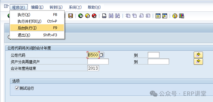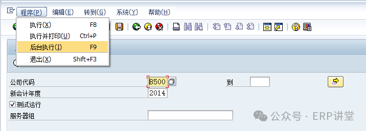 1.1.2.3操作步驟(1)在事物代碼輸入框中填寫(xiě)AJRW,回車(chē): (2)輸入公司代碼和會(huì)計(jì)年度,測(cè)試運(yùn)行。 (3)無(wú)誤后,去掉測(cè)試運(yùn)行,點(diǎn)擊“程序”—“后臺(tái)執(zhí)行”: