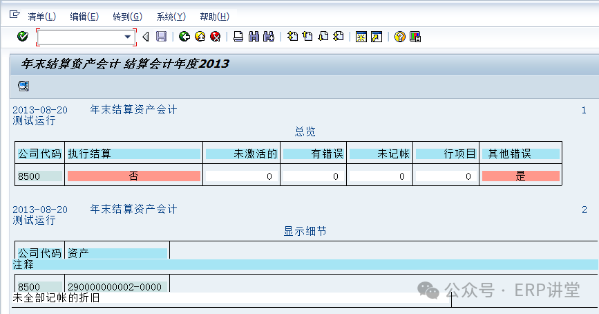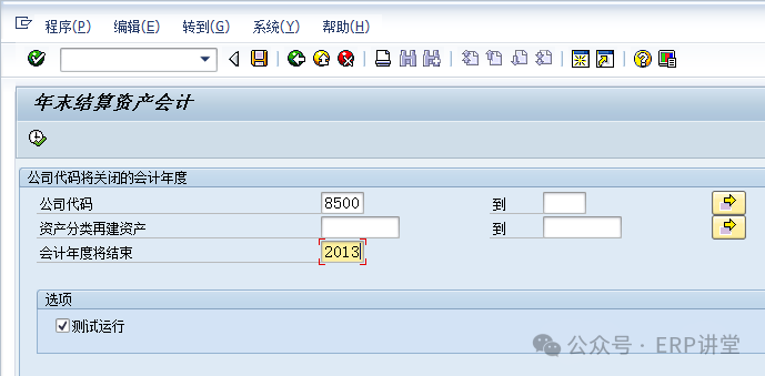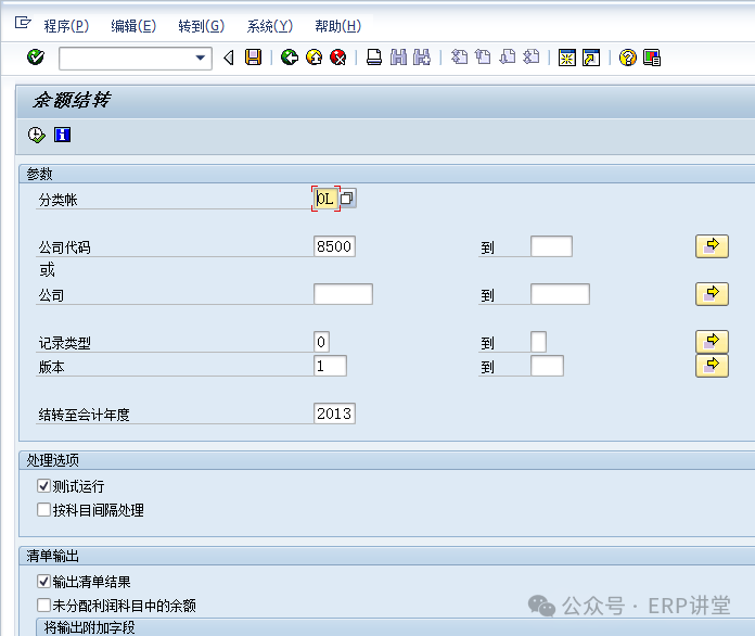1.1.3.4結(jié)論資產(chǎn)余額結(jié)轉(zhuǎn)至下一會(huì)計(jì)年度。 1.1.3.5備注 1.1.4系統(tǒng)操作—總賬余額結(jié)轉(zhuǎn)1.1.4.1操作范例將總賬余額結(jié)轉(zhuǎn)至下一會(huì)計(jì)年度。 總賬科目結(jié)轉(zhuǎn),將總賬科目余額結(jié)轉(zhuǎn)到新的會(huì)計(jì)年度。結(jié)轉(zhuǎn)后,下一年的報(bào)表中會(huì)有期初余額。 1.1.4.2系統(tǒng)菜單及事務(wù)代碼