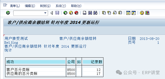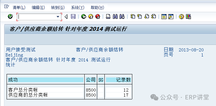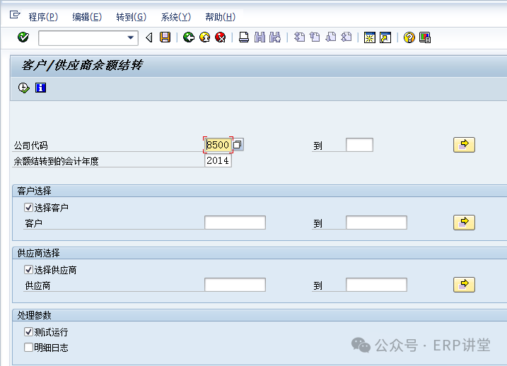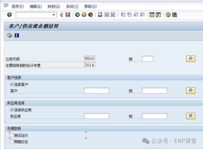 (2)輸入公司代碼,結(jié)轉(zhuǎn)的會(huì)計(jì)年度等信息后,選中測(cè)試運(yùn)行,點(diǎn)擊,系統(tǒng)提示下列標(biāo)記信息: 點(diǎn)擊按鈕,退回到初始界面,取消選擇“測(cè)試運(yùn)行”后正式運(yùn)行即可。 1.1.4.4結(jié)論總賬余額結(jié)轉(zhuǎn)至下一會(huì)計(jì)年度。 1.1.4.5備注1.1.5系統(tǒng)操作—應(yīng)收應(yīng)付往來(lái)余額結(jié)轉(zhuǎn)1.1.5.1操作范例應(yīng)收應(yīng)付科目余額結(jié)轉(zhuǎn)至下一會(huì)計(jì)年度。 在年結(jié)時(shí),需要對(duì)應(yīng)收應(yīng)付的余額進(jìn)行結(jié)轉(zhuǎn)到下一年度,通過(guò)結(jié)轉(zhuǎn),在下一年的相應(yīng)報(bào)表中有相應(yīng)的期初余額。 1.1.5.2系統(tǒng)菜單及事務(wù)代碼