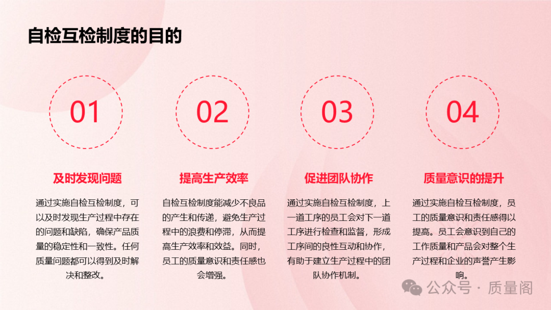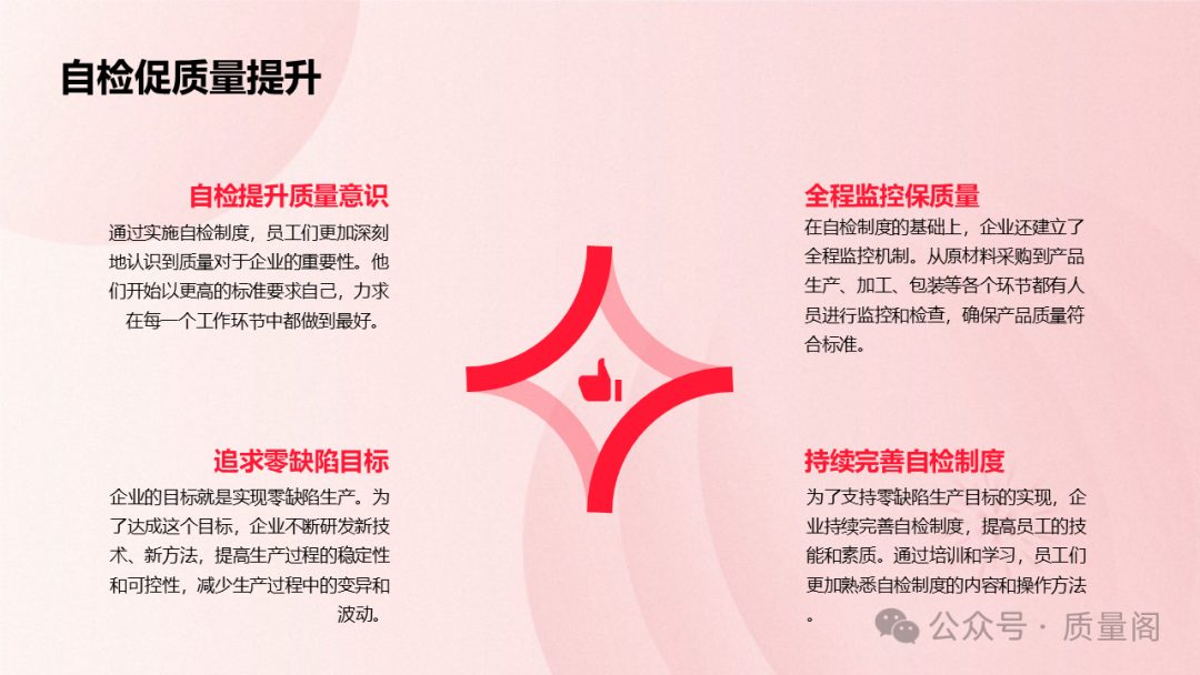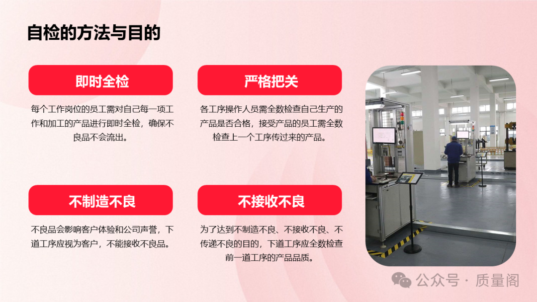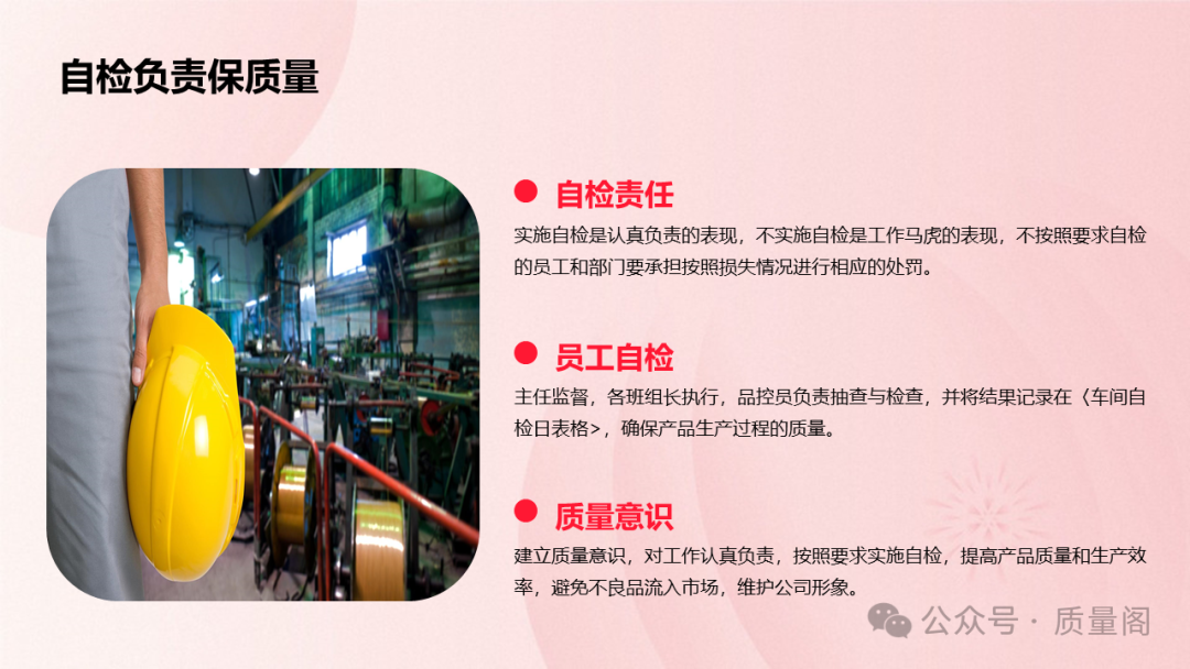 實(shí)施自檢是員工對(duì)工作認(rèn)真負(fù)責(zé)的表現(xiàn)。通過(guò)自檢,員工可以及時(shí)發(fā)現(xiàn)并糾正自己工作中的問(wèn)題,確保產(chǎn)品質(zhì)量符合要求。這不僅有助于提升員工的個(gè)人素質(zhì)和工作能力,還能增強(qiáng)企業(yè)的凝聚力和向心力。