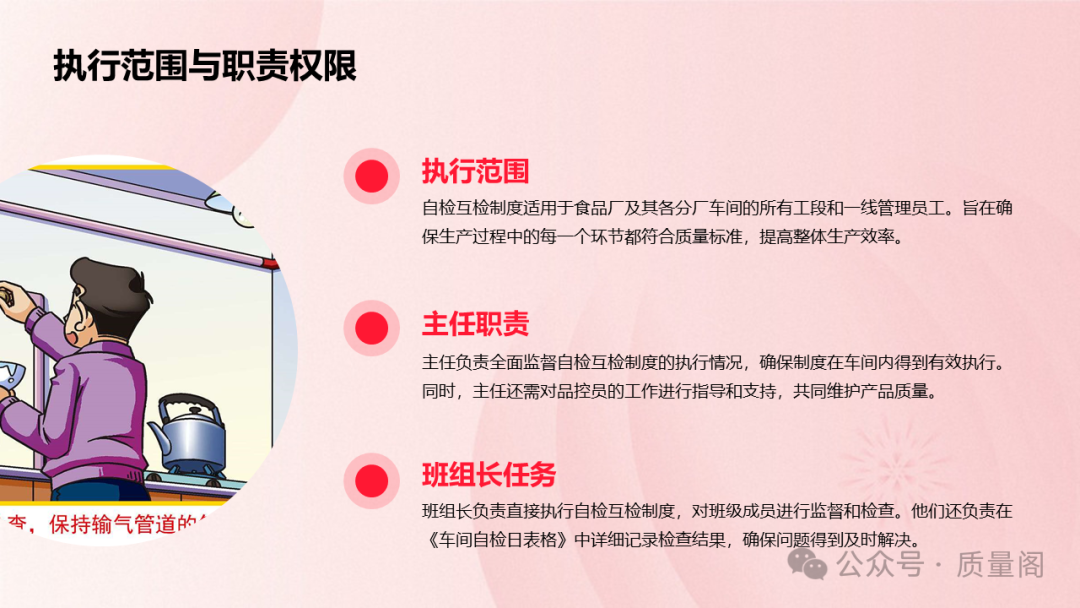 車間自檢互檢制度適用于食品廠及其各分廠車間的各個(gè)工段崗位。這意味著,無(wú)論是生產(chǎn)線的哪個(gè)環(huán)節(jié),每一個(gè)一線管理員工都需要嚴(yán)格遵守該制度。通過(guò)全員參與,企業(yè)可以確保產(chǎn)品質(zhì)量在每個(gè)環(huán)節(jié)都得到保障。