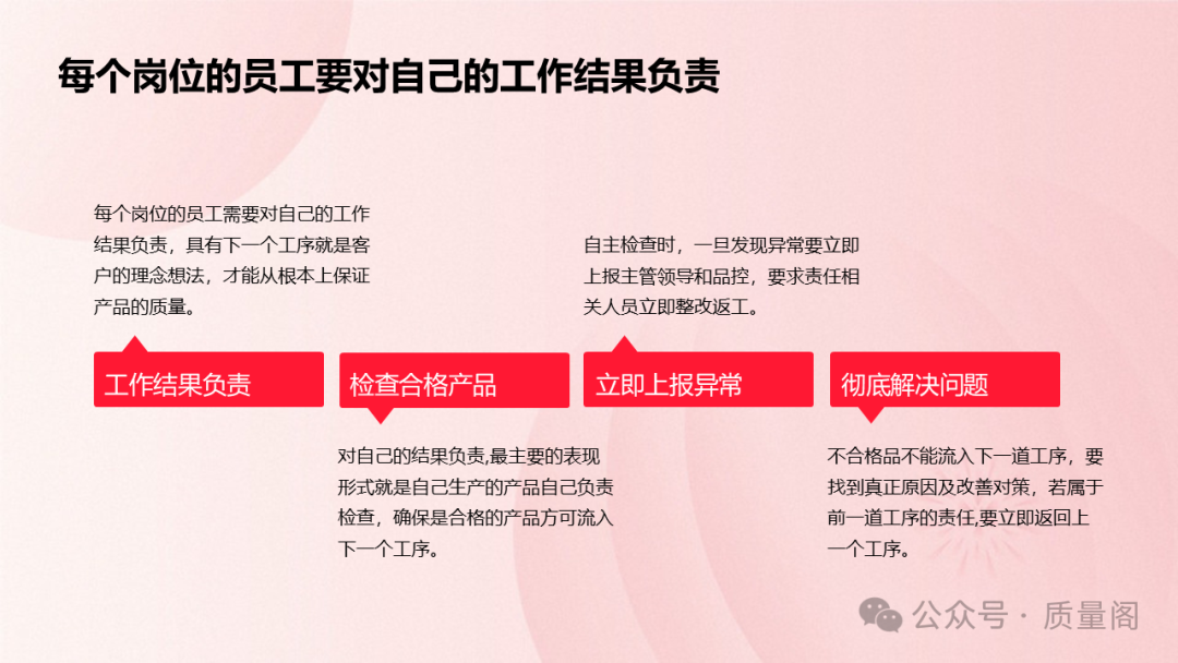 每個(gè)崗位的員工都要對(duì)自己的工作結(jié)果負(fù)責(zé)。這要求員工具備強(qiáng)烈的責(zé)任心和使命感,認(rèn)真對(duì)待每一個(gè)產(chǎn)品和每一項(xiàng)工作。只有這樣,才能從根本上保證產(chǎn)品的質(zhì)量。