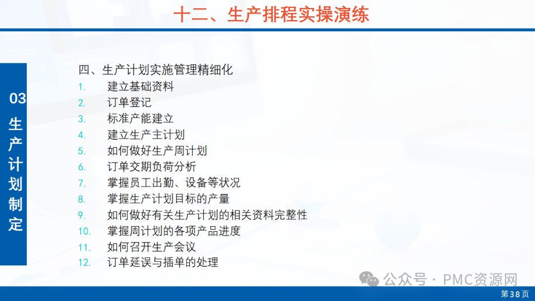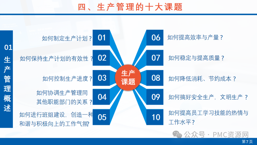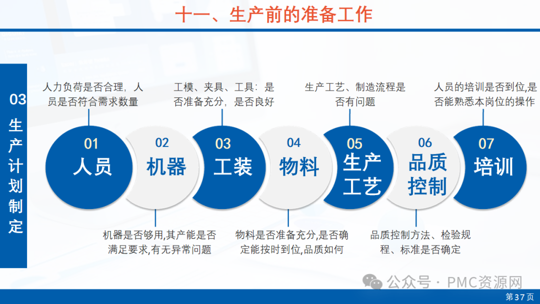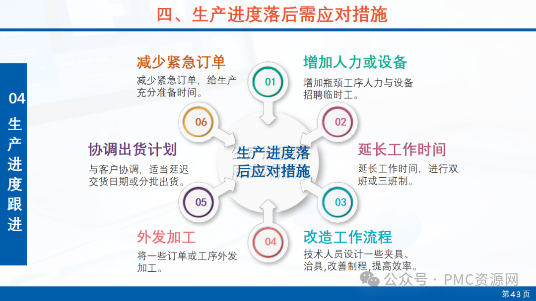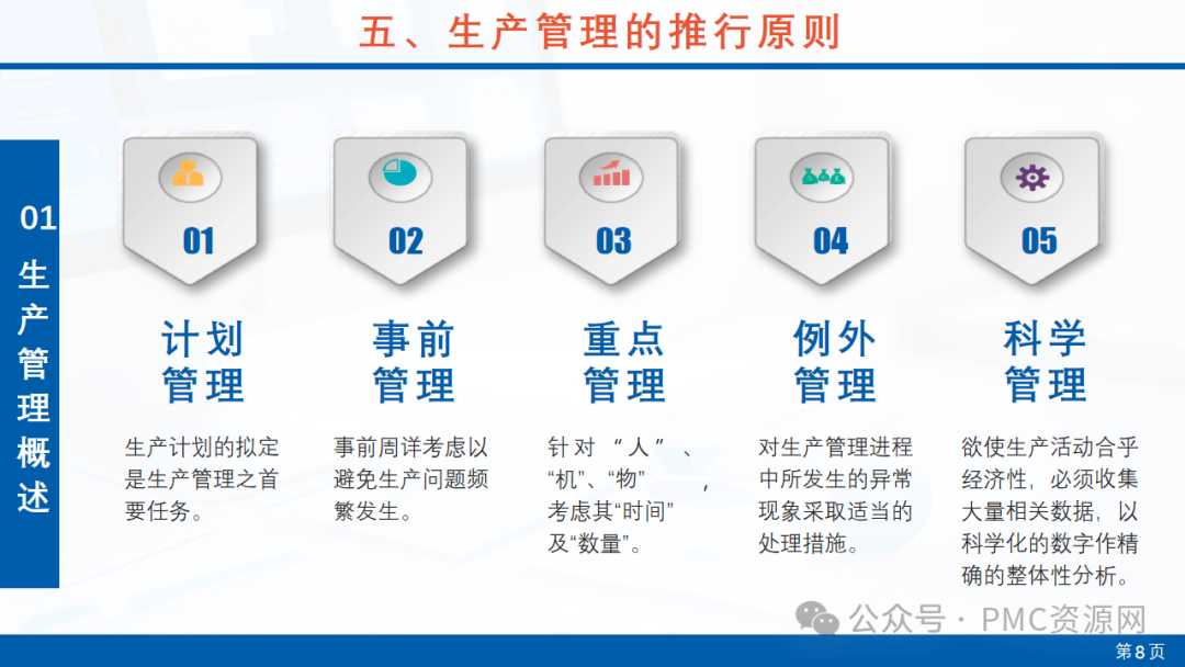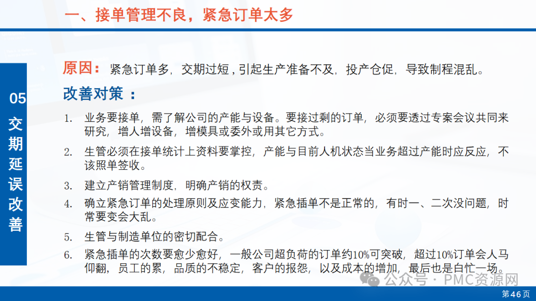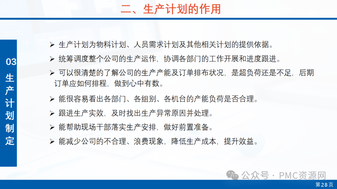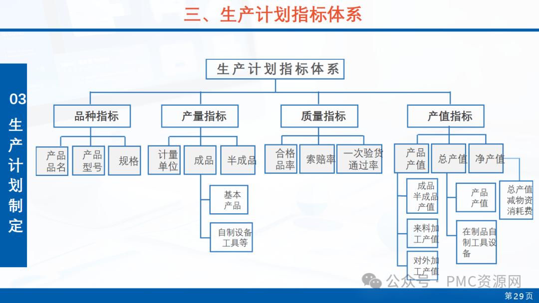 下面為大家分享一份生產(chǎn)計劃管理培訓(xùn)PPT模板,該PPT培訓(xùn)模板從生產(chǎn)管理的基礎(chǔ)概念,到生管部門的具體職能;從生產(chǎn)計劃的制定流程,到生產(chǎn)進(jìn)度的有效控制,再到交期延誤的改善策略,全方位解鎖生產(chǎn)計劃管理的奧秘,它主要從以下5個方面的內(nèi)容展開: 1、生產(chǎn)管理概述 生產(chǎn)型企業(yè)通過投入、轉(zhuǎn)換、產(chǎn)出實現(xiàn)資本、價值和素質(zhì)提升,涉及多個功能平臺。生產(chǎn)管理旨在合理組織生產(chǎn),需考慮人、機(jī)、料等要素,遵循計劃管理、事前管理等原則,其體系涵蓋采購、產(chǎn)銷協(xié)調(diào)等環(huán)節(jié),銷售與生產(chǎn)依特定流程運作,且要滿足連續(xù)性、比例性等基本要求。 2、生管部門職能 生管(PC)負(fù)責(zé)生產(chǎn)計劃編制和跟進(jìn),物控(MC)負(fù)責(zé)物料管控。 生管在企業(yè)中扮演監(jiān)督、協(xié)調(diào)、調(diào)度和物料控制等角色。 生產(chǎn)管理人員需履行計劃、組織、布置、領(lǐng)導(dǎo)和控制等職責(zé),應(yīng)具備責(zé)任心、溝通能力等條件,掌握 PDCA 循環(huán)、5W2H 法等工作技巧,明確具體工作職責(zé)和流程。 3、生產(chǎn)計劃制定 生產(chǎn)計劃依銷售計劃確定,對產(chǎn)品各方面統(tǒng)籌安排。 其作用包括為相關(guān)計劃提供依據(jù)、協(xié)調(diào)生產(chǎn)運作等。 計劃指標(biāo)含品種、質(zhì)量等,內(nèi)容涉及生產(chǎn)產(chǎn)品、數(shù)量等。 排產(chǎn)遵循客戶分類等原則,需滿足綜合考慮因素等條件,編制涉及三要素和三周期,周生產(chǎn)計劃編制實施有特定流程,還需做好生產(chǎn)前準(zhǔn)備工作。 4、生產(chǎn)進(jìn)度控制 控制點包括事務(wù)、采購等進(jìn)度。 控制方法有現(xiàn)場巡查、圖表、報表等。 現(xiàn)場巡查關(guān)注緊急、量大等產(chǎn)品及瓶頸工序。 進(jìn)度落后時可采取減少緊急訂單、協(xié)調(diào)出貨計劃等措施,生產(chǎn)異常處理遵循 “三即三現(xiàn)” 原則。 5、交期延誤改善 分析接單管理、產(chǎn)品技術(shù)變更等方面導(dǎo)致交期延誤的原因,并提出相應(yīng)改善對策,如規(guī)范接單流程、建立變更規(guī)范等。