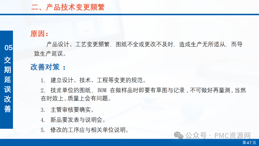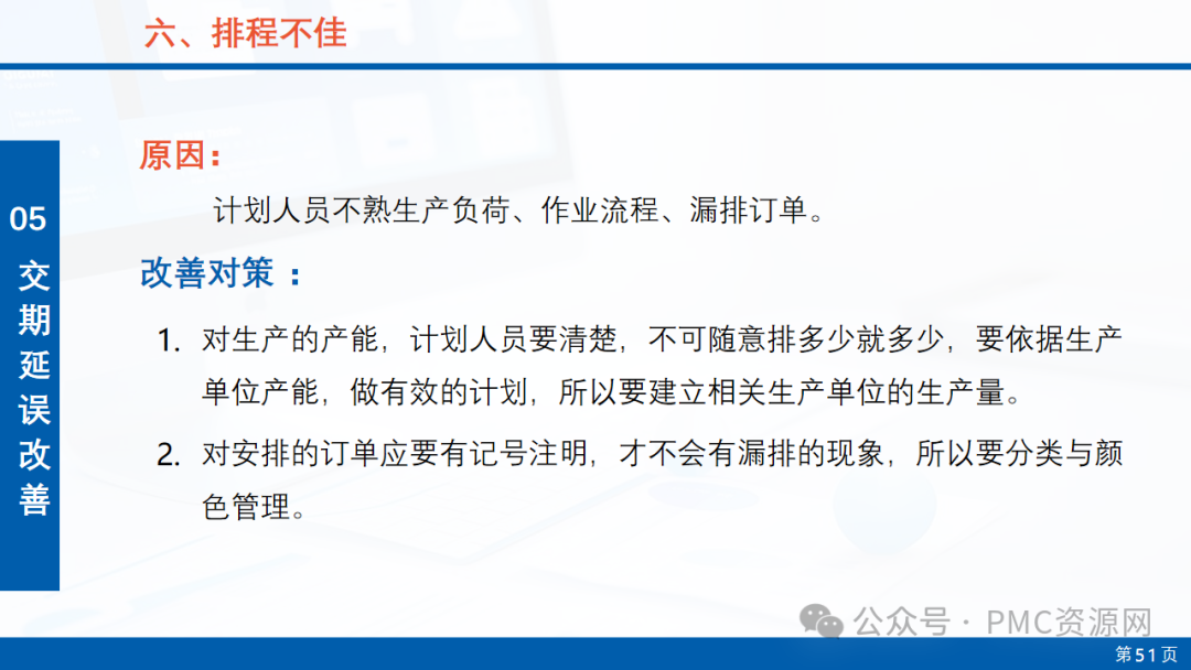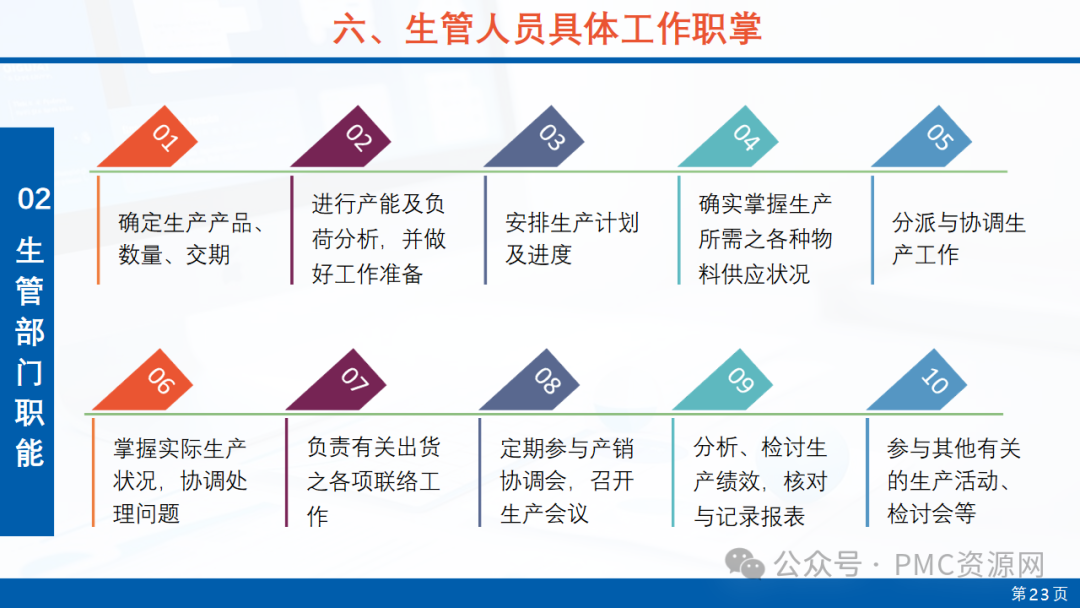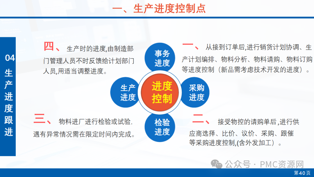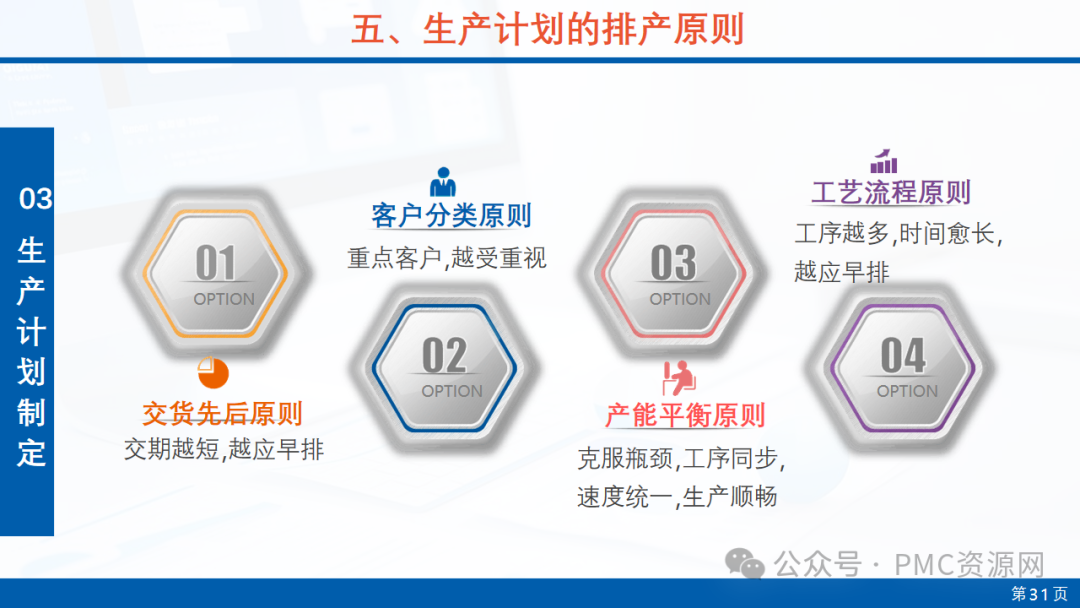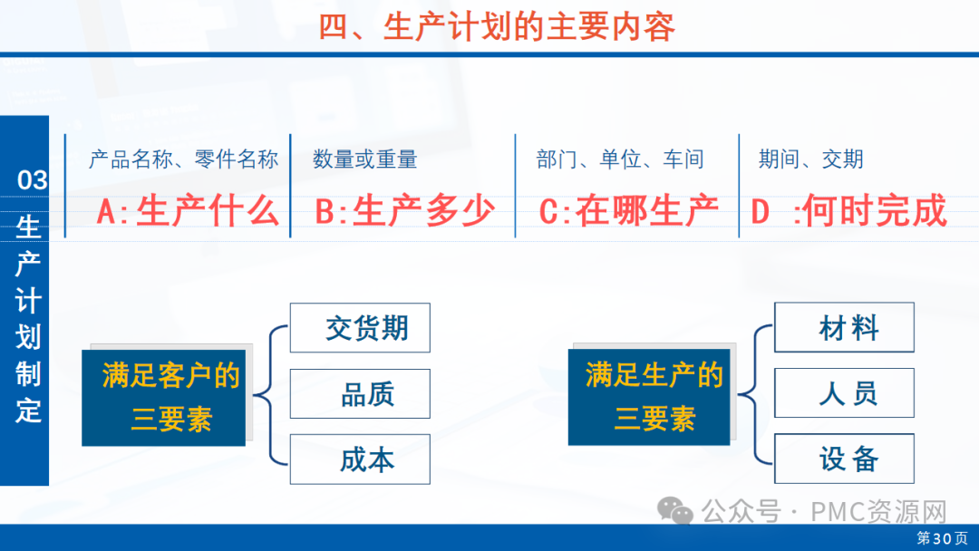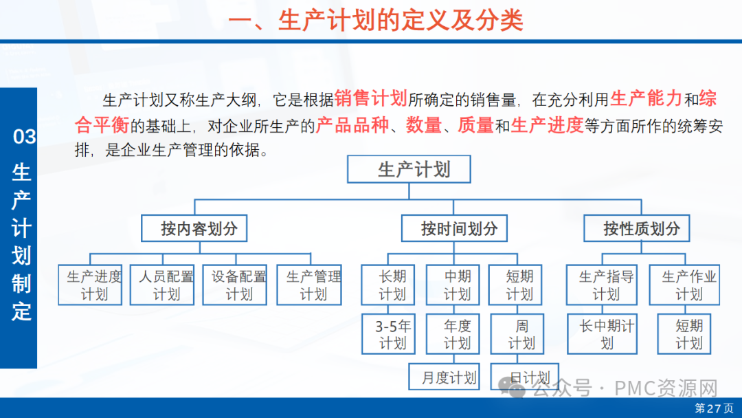 下面為大家分享一份生產(chǎn)計劃管理培訓(xùn)PPT模板,該PPT培訓(xùn)模板從生產(chǎn)管理的基礎(chǔ)概念,到生管部門的具體職能;從生產(chǎn)計劃的制定流程,到生產(chǎn)進(jìn)度的有效控制,再到交期延誤的改善策略,全方位解鎖生產(chǎn)計劃管理的奧秘,它主要從以下5個方面的內(nèi)容展開: 1、生產(chǎn)管理概述 生產(chǎn)型企業(yè)通過投入、轉(zhuǎn)換、產(chǎn)出實現(xiàn)資本、價值和素質(zhì)提升,涉及多個功能平臺。生產(chǎn)管理旨在合理組織生產(chǎn),需考慮人、機(jī)、料等要素,遵循計劃管理、事前管理等原則,其體系涵蓋采購、產(chǎn)銷協(xié)調(diào)等環(huán)節(jié),銷售與生產(chǎn)依特定流程運作,且要滿足連續(xù)性、比例性等基本要求。 2、生管部門職能 生管(PC)負(fù)責(zé)生產(chǎn)計劃編制和跟進(jìn),物控(MC)負(fù)責(zé)物料管控。 生管在企業(yè)中扮演監(jiān)督、協(xié)調(diào)、調(diào)度和物料控制等角色。 生產(chǎn)管理人員需履行計劃、組織、布置、領(lǐng)導(dǎo)和控制等職責(zé),應(yīng)具備責(zé)任心、溝通能力等條件,掌握 PDCA 循環(huán)、5W2H 法等工作技巧,明確具體工作職責(zé)和流程。 3、生產(chǎn)計劃制定 生產(chǎn)計劃依銷售計劃確定,對產(chǎn)品各方面統(tǒng)籌安排。 其作用包括為相關(guān)計劃提供依據(jù)、協(xié)調(diào)生產(chǎn)運作等。 計劃指標(biāo)含品種、質(zhì)量等,內(nèi)容涉及生產(chǎn)產(chǎn)品、數(shù)量等。 排產(chǎn)遵循客戶分類等原則,需滿足綜合考慮因素等條件,編制涉及三要素和三周期,周生產(chǎn)計劃編制實施有特定流程,還需做好生產(chǎn)前準(zhǔn)備工作。 4、生產(chǎn)進(jìn)度控制 控制點包括事務(wù)、采購等進(jìn)度。 控制方法有現(xiàn)場巡查、圖表、報表等。 現(xiàn)場巡查關(guān)注緊急、量大等產(chǎn)品及瓶頸工序。 進(jìn)度落后時可采取減少緊急訂單、協(xié)調(diào)出貨計劃等措施,生產(chǎn)異常處理遵循 “三即三現(xiàn)” 原則。 5、交期延誤改善 分析接單管理、產(chǎn)品技術(shù)變更等方面導(dǎo)致交期延誤的原因,并提出相應(yīng)改善對策,如規(guī)范接單流程、建立變更規(guī)范等。
