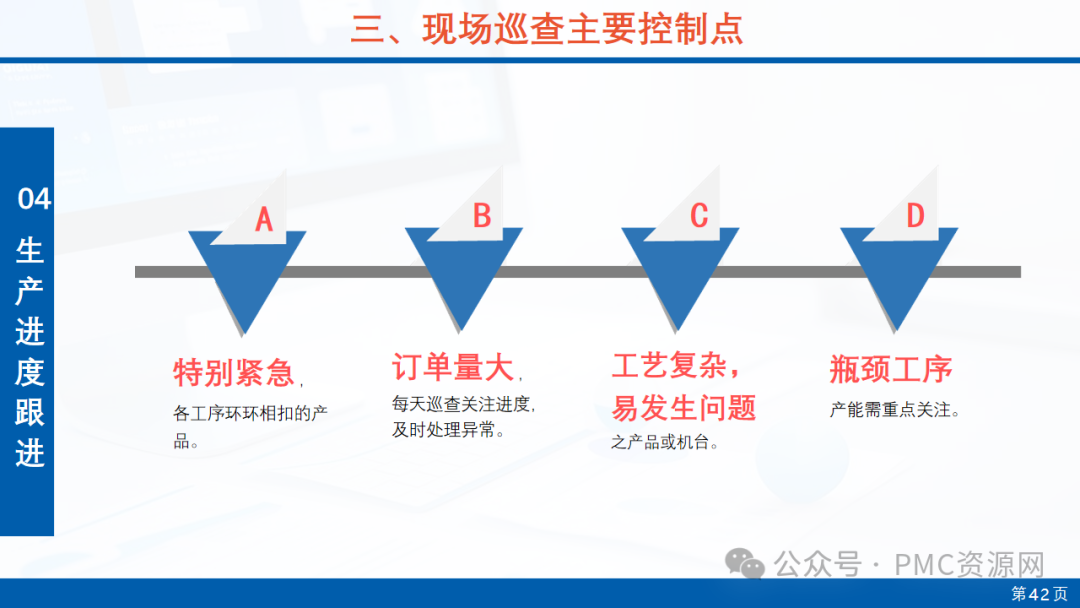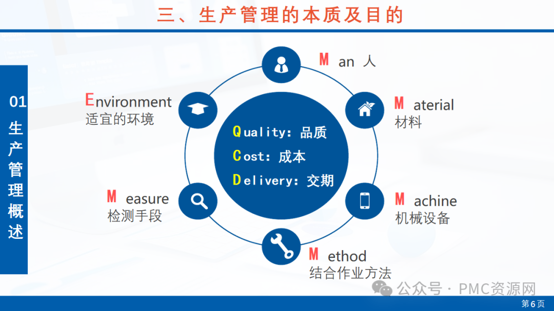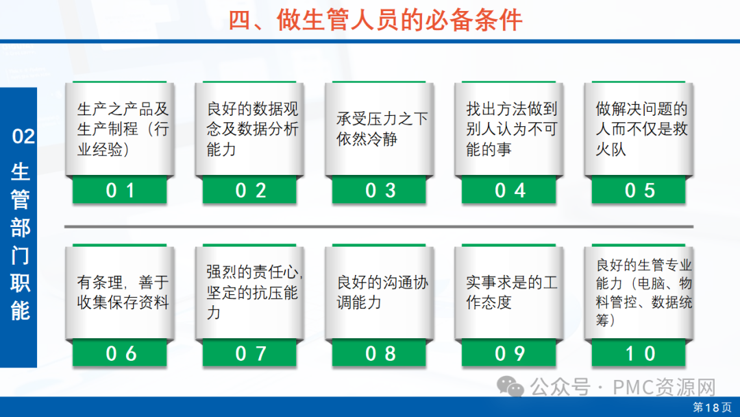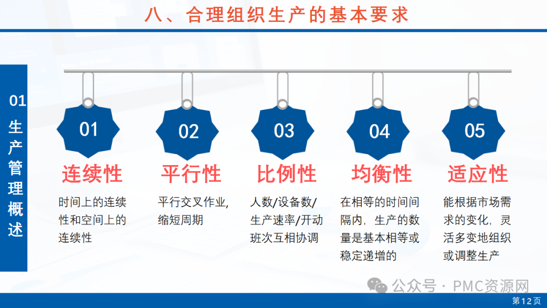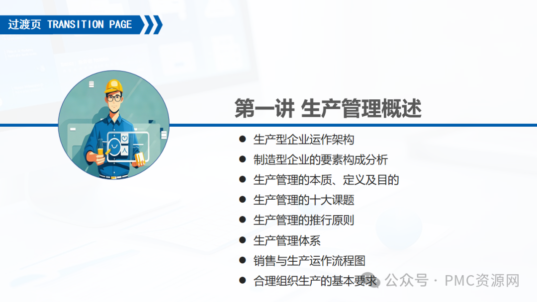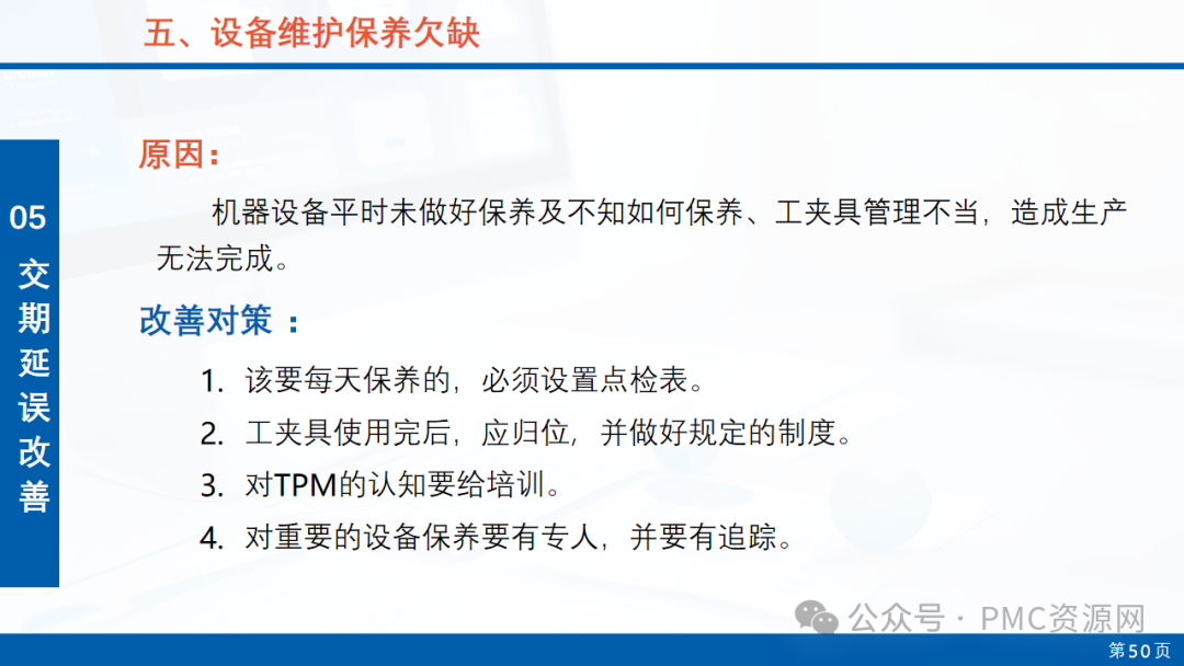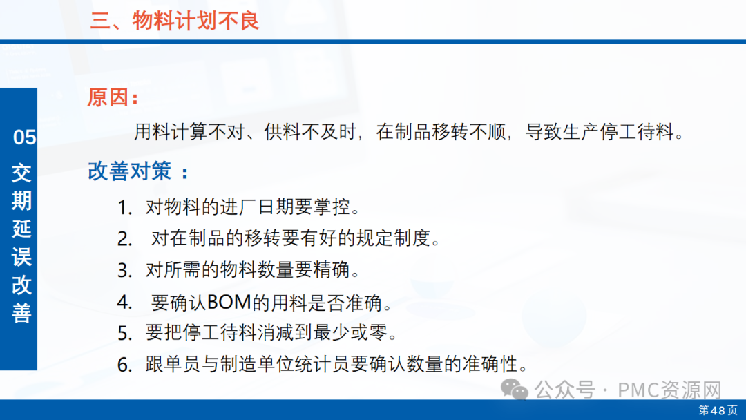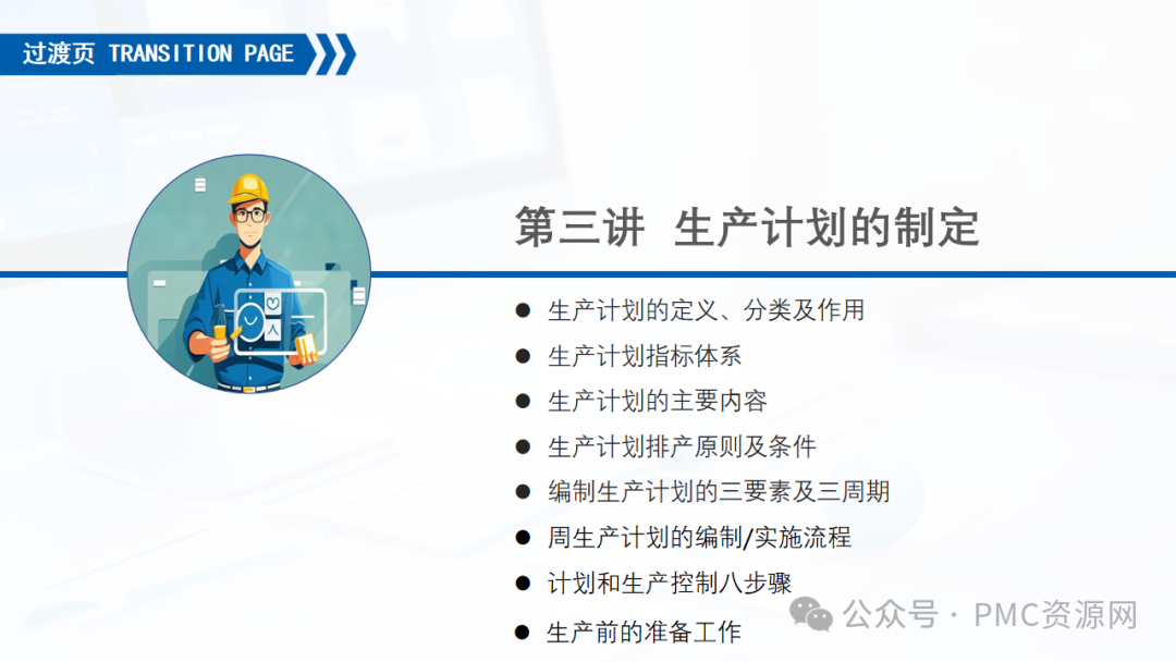 下面為大家分享一份生產(chǎn)計劃管理培訓(xùn)PPT模板,該PPT培訓(xùn)模板從生產(chǎn)管理的基礎(chǔ)概念,到生管部門的具體職能;從生產(chǎn)計劃的制定流程,到生產(chǎn)進(jìn)度的有效控制,再到交期延誤的改善策略,全方位解鎖生產(chǎn)計劃管理的奧秘,它主要從以下5個方面的內(nèi)容展開: 1、生產(chǎn)管理概述 生產(chǎn)型企業(yè)通過投入、轉(zhuǎn)換、產(chǎn)出實現(xiàn)資本、價值和素質(zhì)提升,涉及多個功能平臺。生產(chǎn)管理旨在合理組織生產(chǎn),需考慮人、機(jī)、料等要素,遵循計劃管理、事前管理等原則,其體系涵蓋采購、產(chǎn)銷協(xié)調(diào)等環(huán)節(jié),銷售與生產(chǎn)依特定流程運作,且要滿足連續(xù)性、比例性等基本要求。 2、生管部門職能 生管(PC)負(fù)責(zé)生產(chǎn)計劃編制和跟進(jìn),物控(MC)負(fù)責(zé)物料管控。 生管在企業(yè)中扮演監(jiān)督、協(xié)調(diào)、調(diào)度和物料控制等角色。 生產(chǎn)管理人員需履行計劃、組織、布置、領(lǐng)導(dǎo)和控制等職責(zé),應(yīng)具備責(zé)任心、溝通能力等條件,掌握 PDCA 循環(huán)、5W2H 法等工作技巧,明確具體工作職責(zé)和流程。 3、生產(chǎn)計劃制定 生產(chǎn)計劃依銷售計劃確定,對產(chǎn)品各方面統(tǒng)籌安排。 其作用包括為相關(guān)計劃提供依據(jù)、協(xié)調(diào)生產(chǎn)運作等。 計劃指標(biāo)含品種、質(zhì)量等,內(nèi)容涉及生產(chǎn)產(chǎn)品、數(shù)量等。 排產(chǎn)遵循客戶分類等原則,需滿足綜合考慮因素等條件,編制涉及三要素和三周期,周生產(chǎn)計劃編制實施有特定流程,還需做好生產(chǎn)前準(zhǔn)備工作。 4、生產(chǎn)進(jìn)度控制 控制點包括事務(wù)、采購等進(jìn)度。 控制方法有現(xiàn)場巡查、圖表、報表等。 現(xiàn)場巡查關(guān)注緊急、量大等產(chǎn)品及瓶頸工序。 進(jìn)度落后時可采取減少緊急訂單、協(xié)調(diào)出貨計劃等措施,生產(chǎn)異常處理遵循 “三即三現(xiàn)” 原則。 5、交期延誤改善 分析接單管理、產(chǎn)品技術(shù)變更等方面導(dǎo)致交期延誤的原因,并提出相應(yīng)改善對策,如規(guī)范接單流程、建立變更規(guī)范等。