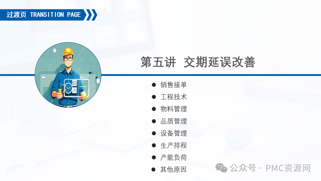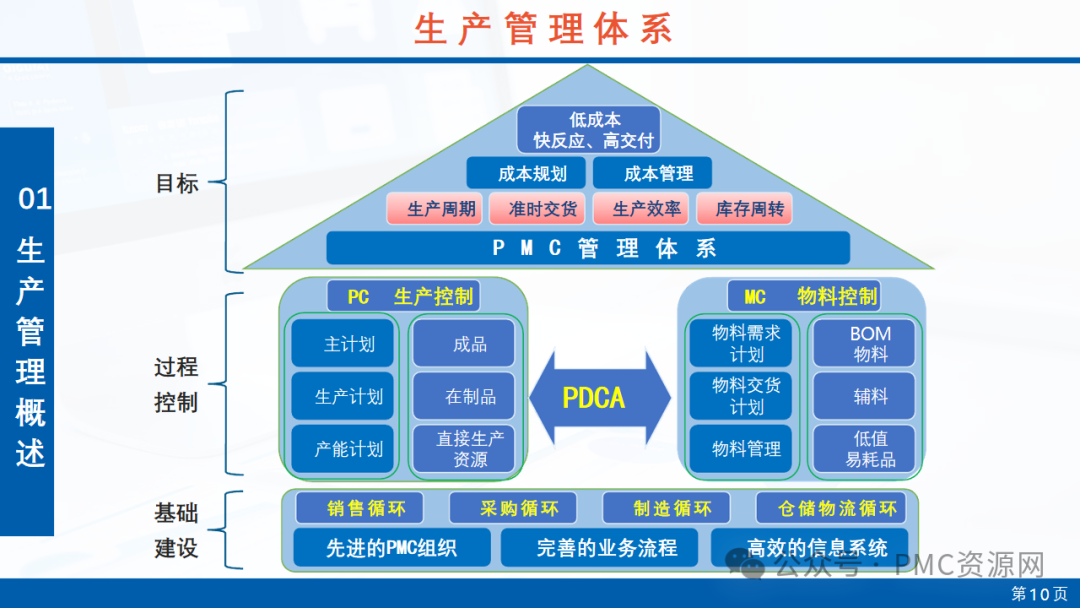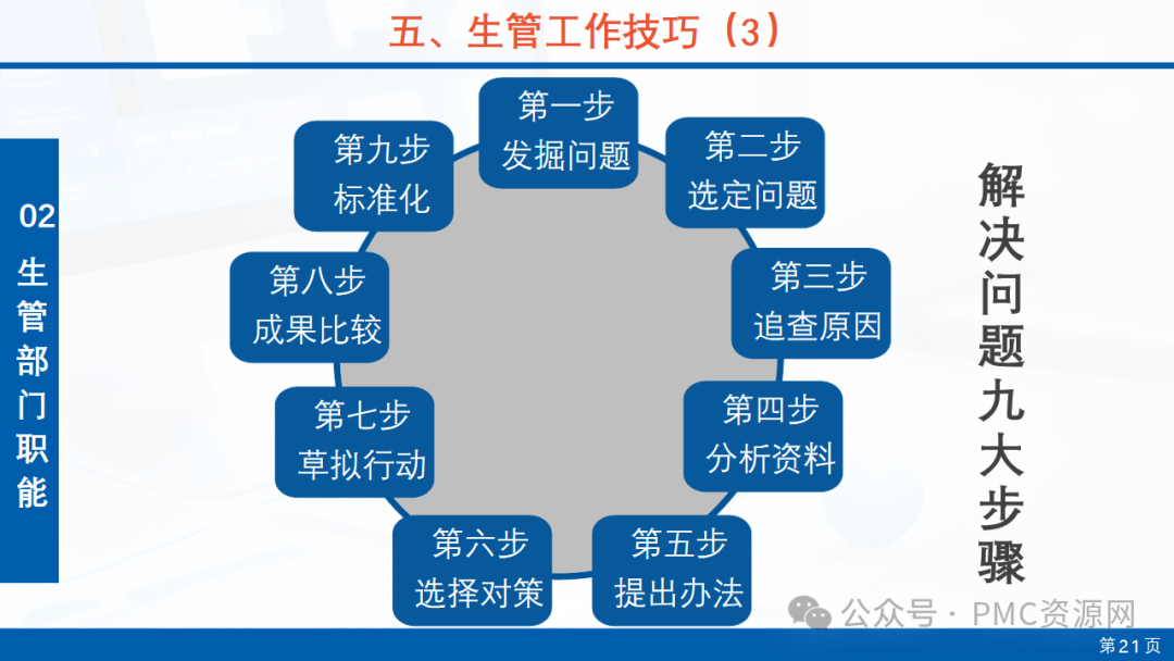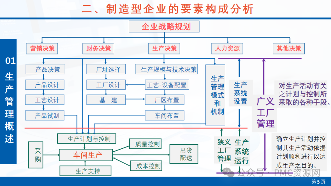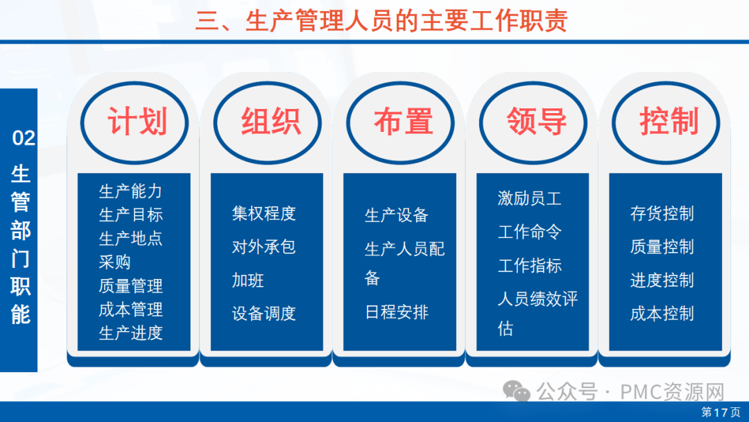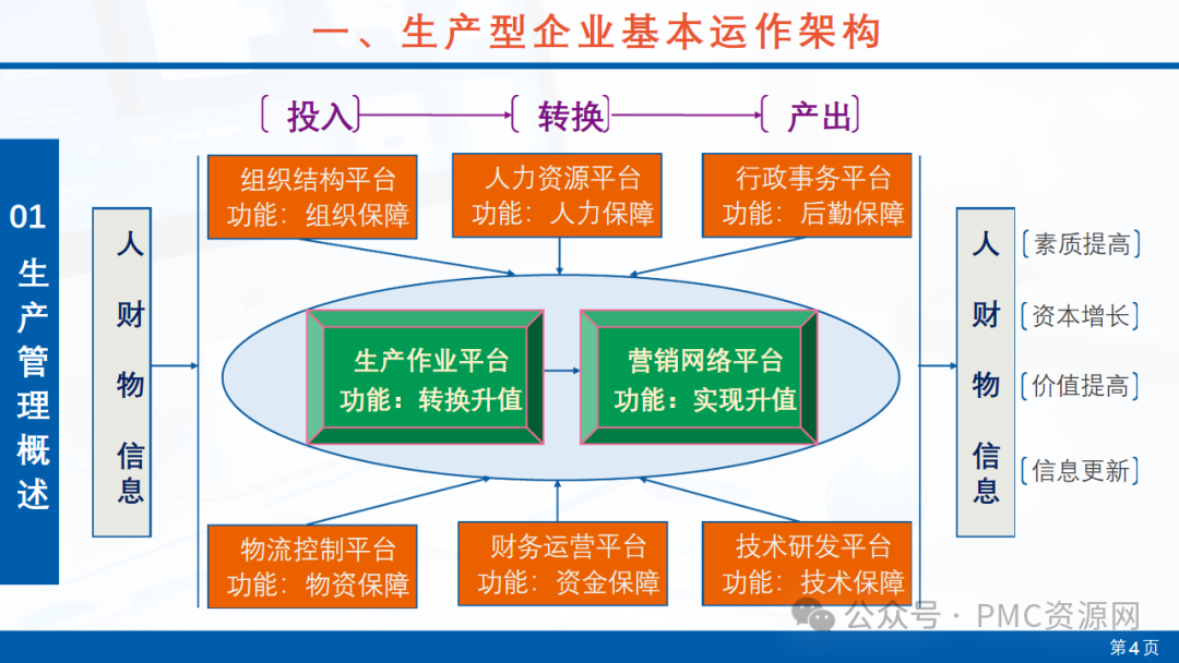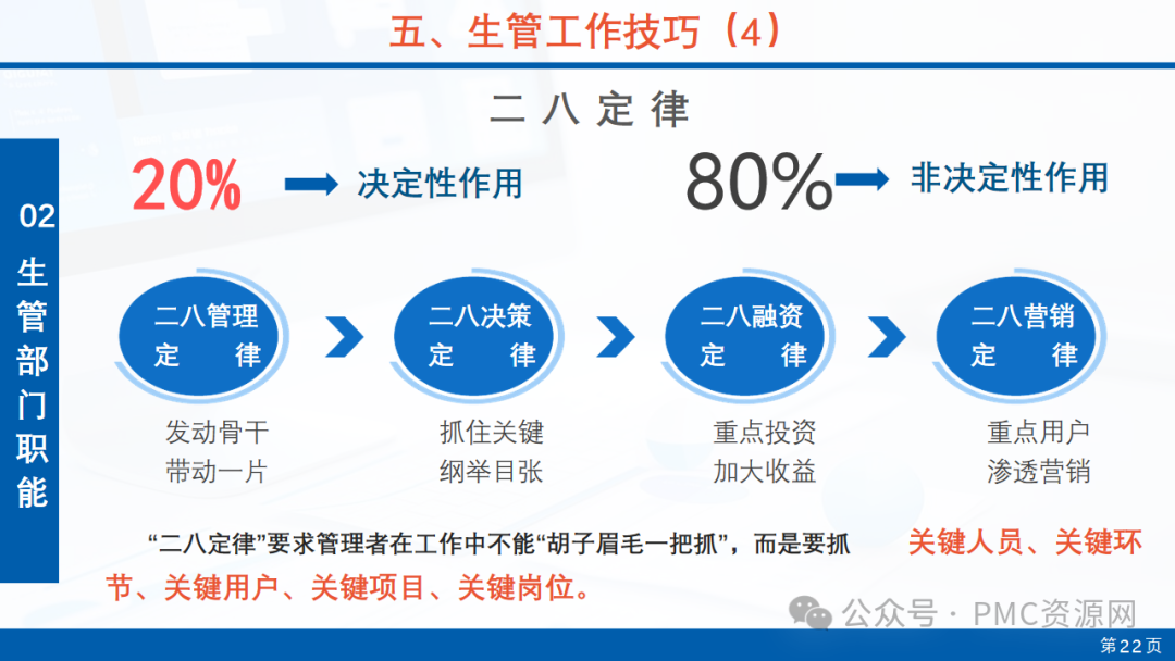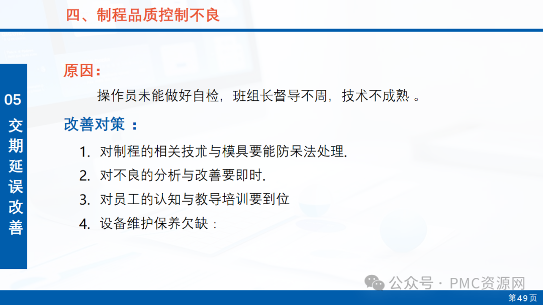 下面為大家分享一份生產(chǎn)計劃管理培訓(xùn)PPT模板,該PPT培訓(xùn)模板從生產(chǎn)管理的基礎(chǔ)概念,到生管部門的具體職能;從生產(chǎn)計劃的制定流程,到生產(chǎn)進(jìn)度的有效控制,再到交期延誤的改善策略,全方位解鎖生產(chǎn)計劃管理的奧秘,它主要從以下5個方面的內(nèi)容展開: 1、生產(chǎn)管理概述 生產(chǎn)型企業(yè)通過投入、轉(zhuǎn)換、產(chǎn)出實現(xiàn)資本、價值和素質(zhì)提升,涉及多個功能平臺。生產(chǎn)管理旨在合理組織生產(chǎn),需考慮人、機(jī)、料等要素,遵循計劃管理、事前管理等原則,其體系涵蓋采購、產(chǎn)銷協(xié)調(diào)等環(huán)節(jié),銷售與生產(chǎn)依特定流程運作,且要滿足連續(xù)性、比例性等基本要求。 2、生管部門職能 生管(PC)負(fù)責(zé)生產(chǎn)計劃編制和跟進(jìn),物控(MC)負(fù)責(zé)物料管控。 生管在企業(yè)中扮演監(jiān)督、協(xié)調(diào)、調(diào)度和物料控制等角色。 生產(chǎn)管理人員需履行計劃、組織、布置、領(lǐng)導(dǎo)和控制等職責(zé),應(yīng)具備責(zé)任心、溝通能力等條件,掌握 PDCA 循環(huán)、5W2H 法等工作技巧,明確具體工作職責(zé)和流程。 3、生產(chǎn)計劃制定 生產(chǎn)計劃依銷售計劃確定,對產(chǎn)品各方面統(tǒng)籌安排。 其作用包括為相關(guān)計劃提供依據(jù)、協(xié)調(diào)生產(chǎn)運作等。 計劃指標(biāo)含品種、質(zhì)量等,內(nèi)容涉及生產(chǎn)產(chǎn)品、數(shù)量等。 排產(chǎn)遵循客戶分類等原則,需滿足綜合考慮因素等條件,編制涉及三要素和三周期,周生產(chǎn)計劃編制實施有特定流程,還需做好生產(chǎn)前準(zhǔn)備工作。 4、生產(chǎn)進(jìn)度控制 控制點包括事務(wù)、采購等進(jìn)度。 控制方法有現(xiàn)場巡查、圖表、報表等。 現(xiàn)場巡查關(guān)注緊急、量大等產(chǎn)品及瓶頸工序。 進(jìn)度落后時可采取減少緊急訂單、協(xié)調(diào)出貨計劃等措施,生產(chǎn)異常處理遵循 “三即三現(xiàn)” 原則。 5、交期延誤改善 分析接單管理、產(chǎn)品技術(shù)變更等方面導(dǎo)致交期延誤的原因,并提出相應(yīng)改善對策,如規(guī)范接單流程、建立變更規(guī)范等。