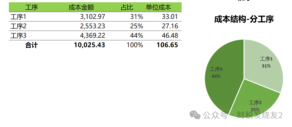 ?這個(gè)產(chǎn)品成本占比最大的是前道工序成本,占比56%,這個(gè)結(jié)構(gòu)對(duì)于管控工序3是有意義的,但是對(duì)于公司更想知道這個(gè)完工產(chǎn)品中真正的料工費(fèi)各占比多少于是我們需要進(jìn)行成本還原動(dòng)作-就是把最后1道工序中的前道工序成本進(jìn)行還原為真正的料工費(fèi)成本還原我們則要逆著來(lái)從工序3→工序2→工序1我們從工序3開(kāi)始,因?yàn)橥旯こ善分杏星暗拦ば虻某杀?656.2就是依據(jù)什么將這5656.2分?jǐn)偟焦ば?中的成本項(xiàng)目結(jié)構(gòu)呢?我們依據(jù)上一個(gè)工序完工產(chǎn)品的各成本項(xiàng)目占比進(jìn)行還原比如工序2中的完工產(chǎn)品中的前道工序成本占比=2,925.40/5,332.52=54.9%;同樣的方法可以計(jì)算出材料成本占比=27.1%;直接人工占比=11%;制造費(fèi)用占比=6.9%;所以工序3中的前道工序的成本5656.2還原到工序的過(guò)程:前道工序成本=5656.2×54.9%=3102.97材料成本=5656.2×27.1%=1535.49制造費(fèi)用=5656.2×6.9%=392.99然后繼續(xù)將工序2中的前道工序成本3102.97繼續(xù)還原到工序1的成本項(xiàng)目構(gòu)成依據(jù)的就是工序1中的完工產(chǎn)品的成本項(xiàng)目占比還原成功后就將工序3、工序2和工序2的料工費(fèi)加起來(lái)就有了最終完工產(chǎn)品的料工費(fèi)金額:當(dāng)然我們也可以計(jì)算出完工產(chǎn)品成本中每個(gè)工序的成本占比:當(dāng)然B產(chǎn)品和C產(chǎn)品的計(jì)算邏輯跟上面是一樣的。