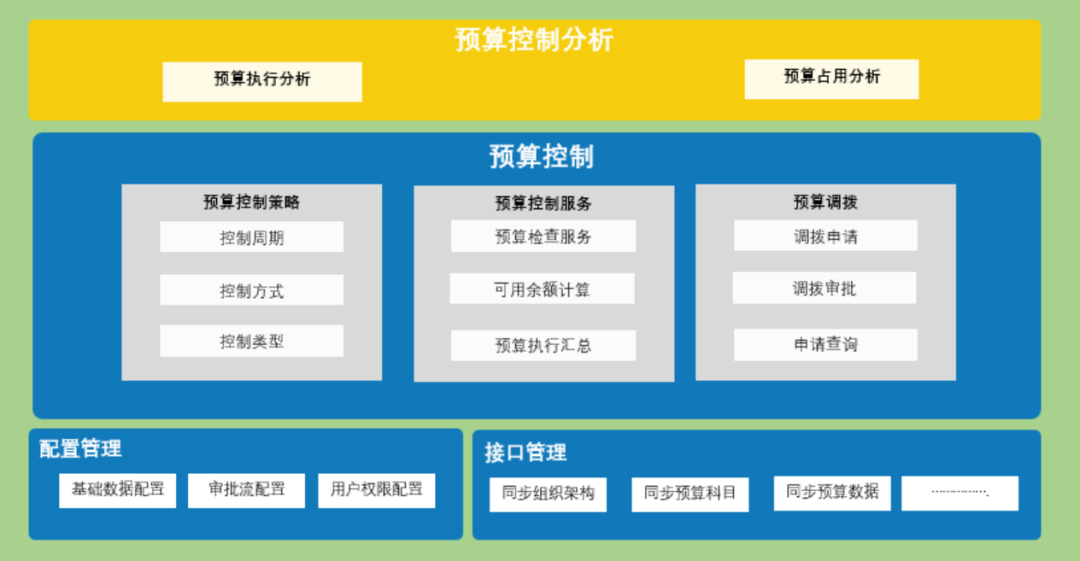 該系統(tǒng)包括預(yù)算控制策略子系統(tǒng)、預(yù)算控制服務(wù)子系統(tǒng)、預(yù)算調(diào)撥子系統(tǒng),以及配置管理模塊、接口管理模塊、預(yù)算控制分析模塊等組成部分。 凍結(jié):指業(yè)務(wù)單據(jù)提交審批后,預(yù)算被暫時保留,但尚未實際使用。