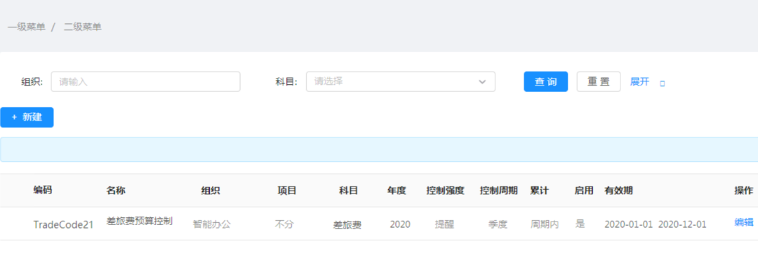 預(yù)算控制平臺是依據(jù)預(yù)算編制結(jié)果及預(yù)算控制策略,對業(yè)務(wù)流程實施控制的平臺。該平臺通過設(shè)定組織、項目、預(yù)算科目、控制強度、控制周期、年份等維度組合,來定義控制業(yè)務(wù)流程的具體規(guī)則。