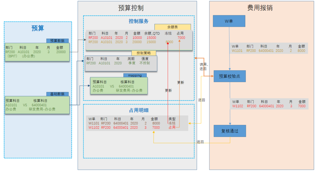 通過費用報銷業(yè)務(wù)流程可以看出,預(yù)算控制并非一次性動作,而是需要在每個業(yè)務(wù)節(jié)點都進行相應(yīng)的控制操作。例如,在申請時進行占用控制,通過時進行耗用控制,不通過時進行沖回控制等。