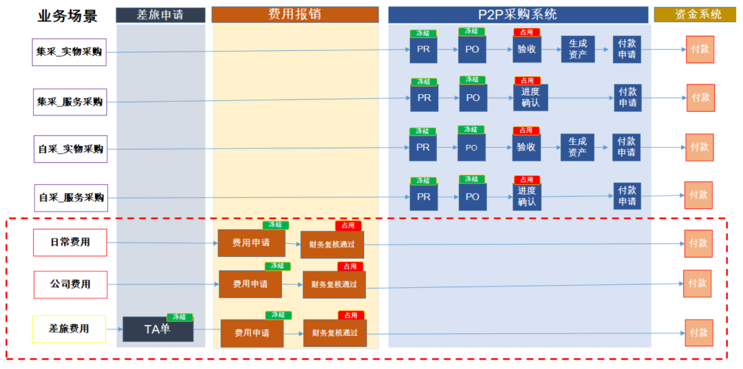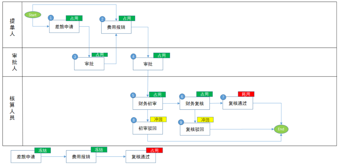 預(yù)算占用是按明細行進行處理的,一旦其中一行超出預(yù)算,則整單視為超預(yù)算。以下是費用報銷的預(yù)算校驗過程。
