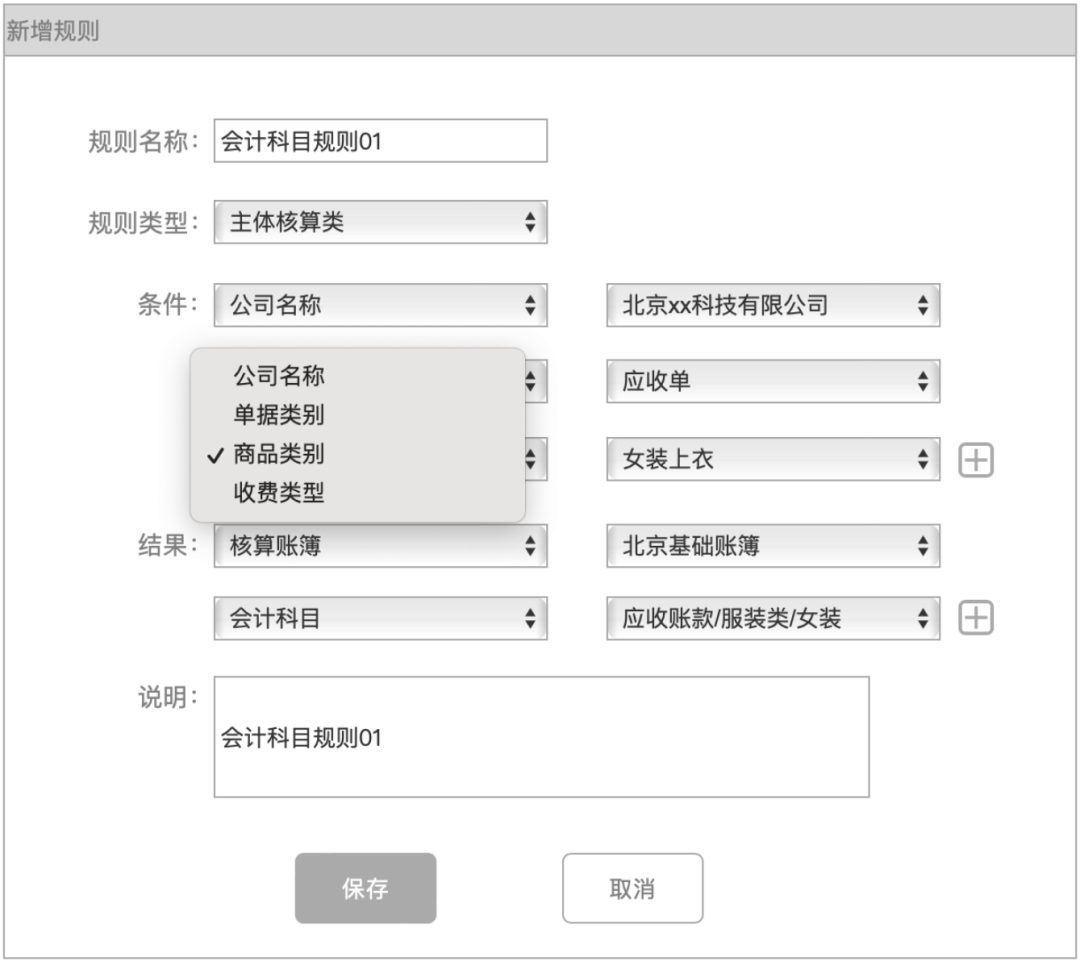理解為:如果業(yè)務數據上的商品類別是【女裝上衣】時,那么對應到賬務系統(tǒng)中的收入成本科目為【服裝類/女裝】。在實際業(yè)務應用中,規(guī)則的條件語句可以是多個,多條件的組合邏輯可以是“或”關系“且”關系等,結果語句同理。