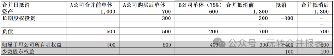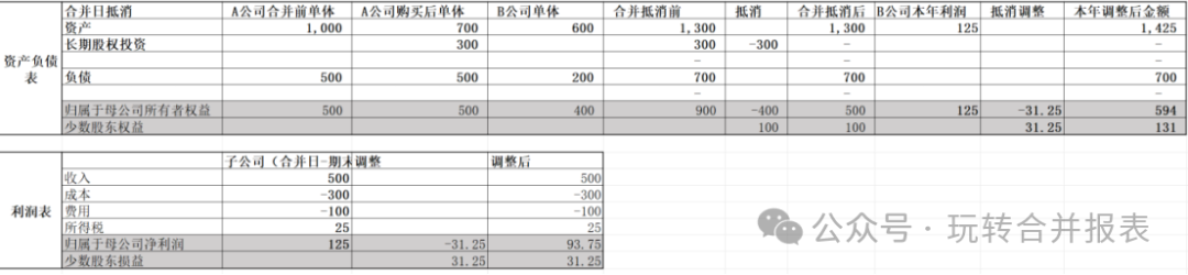 以上表格揭露了合并日及以后年度,合并抵消分錄的原理。 合并日案例如下:(考慮少數(shù)股東的影響) 合并日: (1)A公司支付300萬購買B公司75%的股權(quán); (2)購買前A公司單體銀行存款1000萬,負債500萬,所有者權(quán)益500萬 (3)B公司資產(chǎn)600萬,負債200萬,所有者權(quán)益400萬。 (4)購買后合并為資產(chǎn)1300萬,長期股權(quán)投資300萬,負債700萬,所有者權(quán)益900萬。 (5)合并日需要抵消母公司長期股權(quán)投資與子公司所有者權(quán)益。 (6)值得關(guān)注的是少數(shù)股東權(quán)益在合并日也需要體現(xiàn),該部分屬于少數(shù)股東。 合并日后如下: (1)合并日到期末子公司凈利潤為125萬 (2)利潤表中這125萬需要按少數(shù)股東持股比例進行重新分配,歸屬于母公司凈利潤125/*0.75=93.75,少數(shù)股東損益=125*0.25=31.25. (3)資產(chǎn)負債表中,子公司實現(xiàn)的本年利潤也需要分開披露,歸屬于母公司所有者權(quán)益:93.75萬,少數(shù)股東權(quán)益31.25萬。 (4)當子公司實現(xiàn)盈利的時候,利潤表中全部并入歸屬于母公司凈利潤,資產(chǎn)負債表,全部并入歸屬于母公司所有者權(quán)益,我們需要做調(diào)整分錄,還原少數(shù)股東部分。 借:少數(shù)股東損益 31.25 貸:少數(shù)股東權(quán)益 31.25 (5)同理,其他綜合收益本期變動50萬,也需要區(qū)分少數(shù)股東部分。 借:其他綜合收益 12.5 貸:少數(shù)股東權(quán)益 12.5 (6)本年提取盈利公積需要轉(zhuǎn)回,合并層不認子公司提取的盈余公積: 提取盈余公積單體分錄: 借:提取法定盈余公積 12.5 貸:盈余公積 12.5 合并層需要沖回: 借:提取法定盈余公積 -12.5 貸:盈余公積 -12.5 (7)本年分配股利10萬,子公司分配給母公司的股利需要抵消。 合并層調(diào)整: 借:投資收益 7.5 借:少數(shù)股東權(quán)益 2.5 貸:應(yīng)付普通股股利 10 解析: (1)子公司宣告發(fā)放股利,子公司單體分錄為: 借:應(yīng)付普通股股利 10 貸:應(yīng)付股利 10 (2)母公司單體分錄為: 借:應(yīng)收股利 7.5 貸:投資收益 7.5 (3)往來的抵消為: 借:應(yīng)付股利 7.5 貸:應(yīng)收股利 7.5 (4)合并抵消調(diào)整分錄: 借:投資收益 7.5 貸:少數(shù)股東權(quán)益 2.5 貸:應(yīng)付普通股股利 10 (5)以上分錄 1-4 合并后為: 借:少數(shù)股東權(quán)益 2.5 貸:應(yīng)付股利 2.5 由此可知,分配給母公司的股利全部抵消,分配給少數(shù)股東的股利,合并層面并沒有抵消。 小結(jié) 合并日:母公司的長期股權(quán)投資與子公司的所有者權(quán)益需要抵消。 合并日后:子公司盈利、其他綜合收益變動,少數(shù)股東部分需調(diào)整;提取盈余公積、分配股利需要轉(zhuǎn)回。 合并抵消的原理如下:
