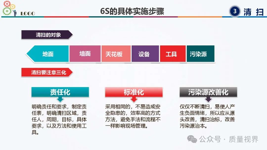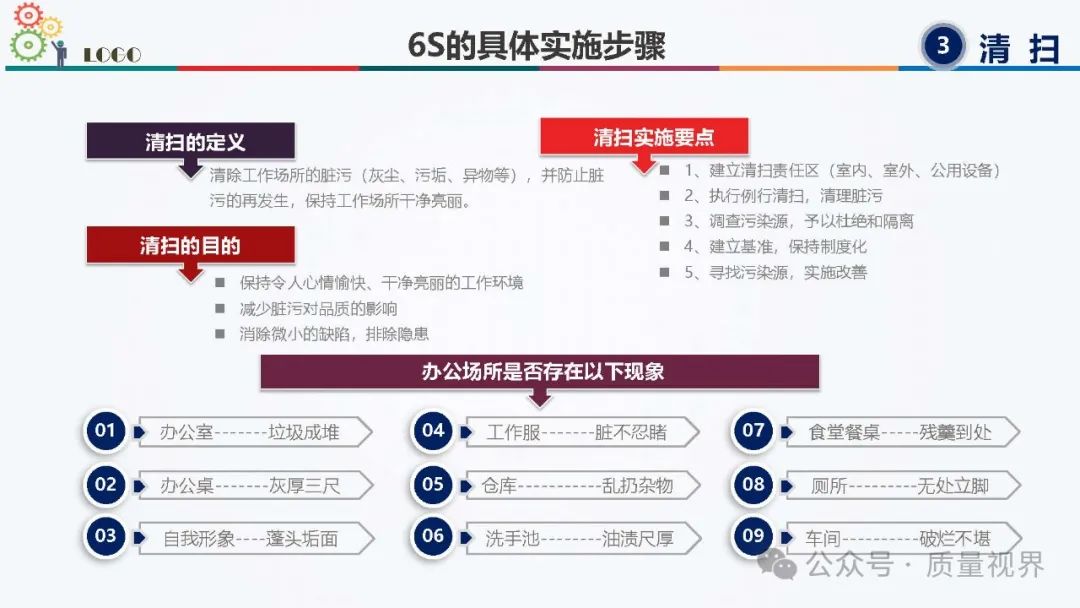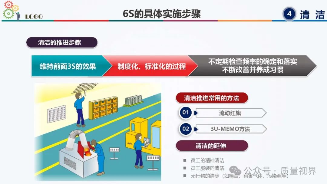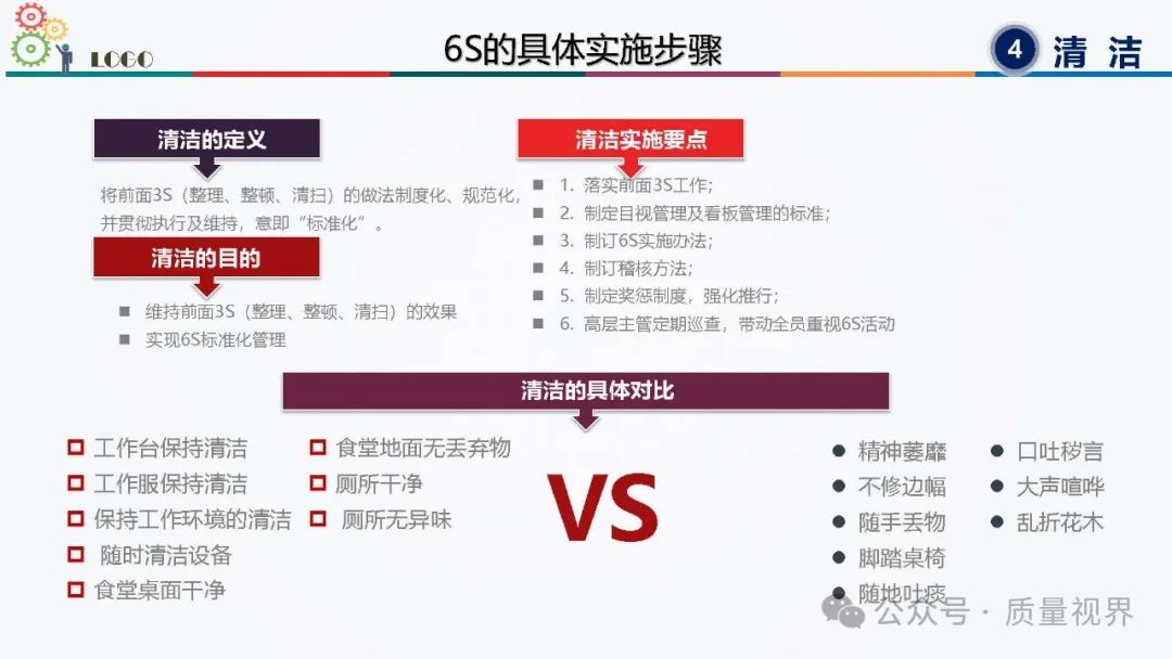 定義:清除工作場所內的臟污,并防止臟污的發(fā)生,保持工作場所干凈亮麗。劃分清掃區(qū)域:將工作場所劃分為若干個清掃區(qū)域,落實到具體的責任人。定期清掃與隨時清掃相結合:制定定期清掃計劃,同時要求員工在工作過程中隨時保持工作區(qū)域的整潔。尋找臟污源頭:分析臟污產生的原因,采取措施從源頭上減少臟污的產生,如對設備進行密封改造,防止漏油。清潔(Seiketsu)