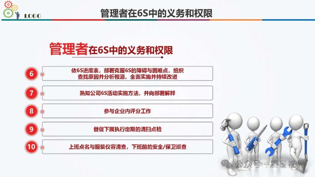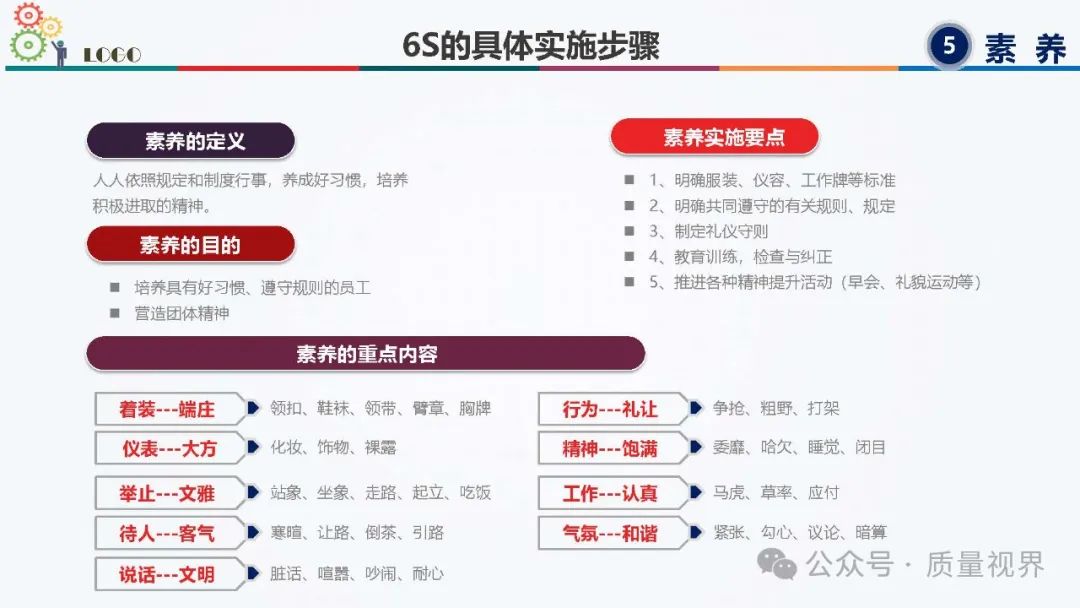 定義:將整理、整頓、清掃進行到底,并且制度化,經常保持環(huán)境處在美觀的狀態(tài)。制定清潔標準:明確整理、整頓、清掃的具體標準和要求,如地面無灰塵、設備無油污等。建立檢查制度:定期對 6S 執(zhí)行情況進行檢查,發(fā)現問題及時整改。強化監(jiān)督:設立專門的監(jiān)督小組,對 6S 執(zhí)行情況進行監(jiān)督和考核,確保各項工作落實到位。素養(yǎng)(Shitsuke)