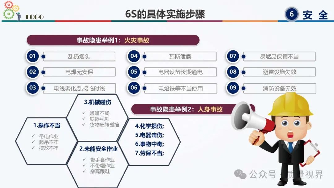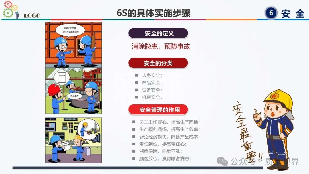 定義:通過培訓和教育,使員工養(yǎng)成良好的工作習慣,遵守規(guī)章制度,自覺執(zhí)行 6S 管理規(guī)定。培訓教育:定期組織 6S 知識培訓,讓員工了解 6S 的意義、目的和具體要求。宣傳引導:通過宣傳欄、內部刊物、標語等形式,宣傳 6S 管理的重要性和成果,營造良好的 6S 氛圍。激勵機制:建立激勵機制,對在 6S 管理中表現優(yōu)秀的員工進行表彰和獎勵,激發(fā)員工的積極性和主動性。安全(Safety)