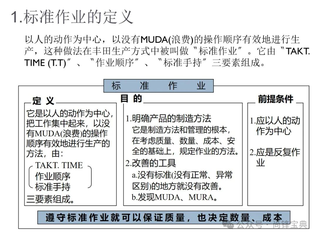 標(biāo)準(zhǔn)作業(yè)是以人為中心,通過(guò)明確操作步驟、時(shí)間要求和資源分配,確保流程一致性、安全性和高效性的規(guī)范性方法?。其起源于豐田生產(chǎn)系統(tǒng)(TPS),是精益制造的基礎(chǔ)?。