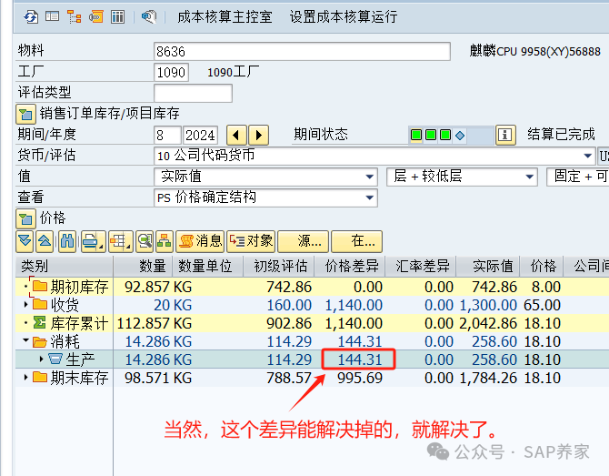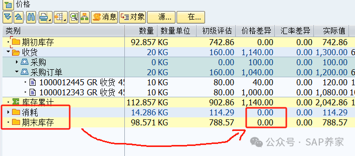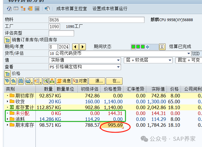 物料分類賬,很多人認為是個神秘的東西,其實講透了,也就沒那么難了。 采購入庫 10個,領(lǐng)用 3個,庫存還剩下 7個,后面會用到這個7.但消耗遠沒這么簡單。銷售出庫也是消耗。 201成本中心領(lǐng)料也是消耗。那么我們是否可以理解為庫存減少就是消耗呢?答案是NO , 202成本中心退料, 雖然是庫存增加但也是消耗。差異在消耗和庫存之間分攤規(guī)則是 按數(shù)量分。(說明:我MMRV是2024年8月,一直沒有改,大家可以忽略日期)特別注意:差異是有多筆組成,現(xiàn)在的總差異是 1140 我們回頭再看上面那張圖,消耗和期初庫存并沒有獲取到差異。大家計算下,1140 的差異是不是按14.286 和 98.571 分的。當然,144.31 沒有出現(xiàn)在,消耗那里,而是未分配那里。我沒有把這個問題隱藏,是想說明一件事。未分攤差異是項目中經(jīng)常發(fā)生的,并且沒有任何固定的解決方案。唯一的辦法就是學(xué)習(xí)并理解物料分類賬,掌握分析方法,以不變應(yīng)萬變。(見下面: 由淺入深學(xué)習(xí)物料賬)案例學(xué)習(xí)不是目的,目的是掌握方法。