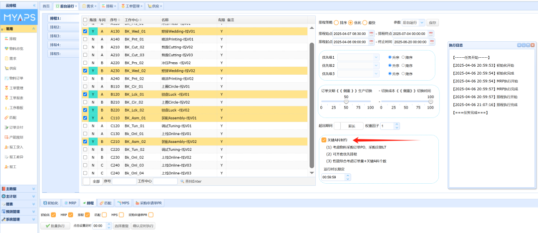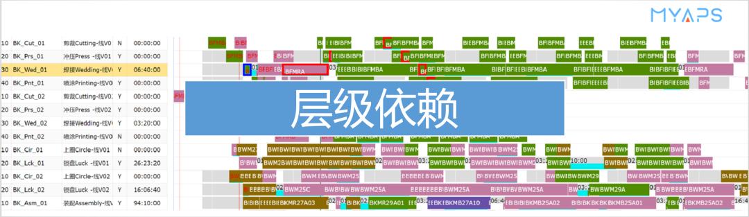 MYAPS系統(tǒng)中,排程運(yùn)算采用【關(guān)鍵A料制約】,系統(tǒng)可模擬多層級BOM的依賴關(guān)系,將BOM分解為獨(dú)立層級,逐層排程并同步協(xié)調(diào),并優(yōu)化資源分配。
