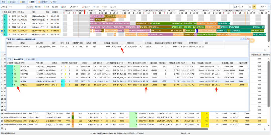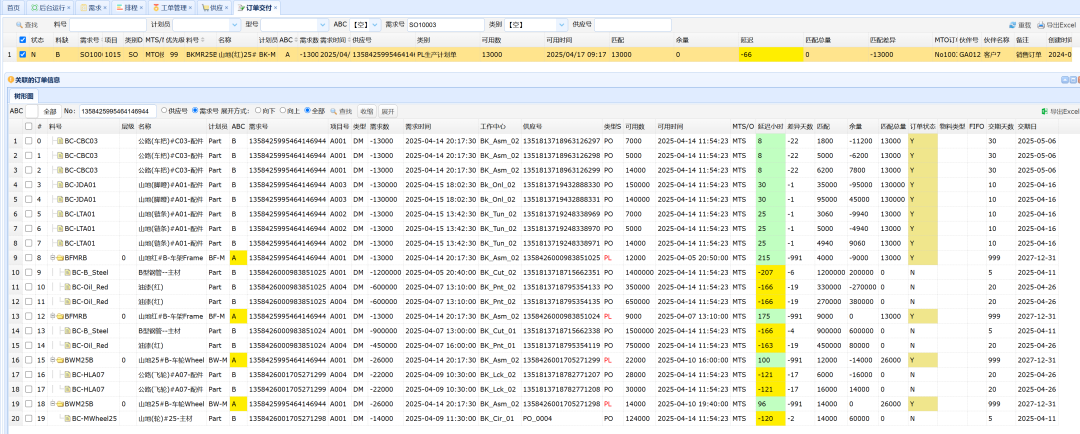 ?運(yùn)算結(jié)果,在甘特圖排程界面上,我們查看【料延遲】發(fā)現(xiàn)A料延遲最小值為“0”, 不存在 負(fù)數(shù),有些產(chǎn)能被放空,沒有被占用。查看對應(yīng)工單的BOM齊套,發(fā)現(xiàn)半成品工單完工可用后,成品工單才開工。多層級訂單齊套報(bào)表:實(shí)時&全面地展現(xiàn)(客戶訂單->成品工單->半成品工單-》零件(采購件)的齊套與缺料關(guān)系。也可從底層采購料的追溯于半成品工單、成品工單,客戶訂單的關(guān)系,時刻跟蹤影響情況。多層級BOM排程的核心在于管理層級間的依賴關(guān)系與資源約束,需結(jié)合APS排程系統(tǒng)、動態(tài)快速調(diào)度策略和供應(yīng)鏈協(xié)同。關(guān)鍵是通過精準(zhǔn)的齊套報(bào)表、全局的缺料計(jì)算分析,溯源影響、實(shí)時數(shù)據(jù)監(jiān)控和快速跟進(jìn),調(diào)整。