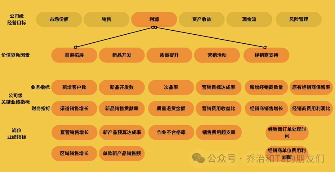 價(jià)值驅(qū)動(dòng)因素是指影響戰(zhàn)略執(zhí)行和價(jià)值創(chuàng)造的可衡量因素,也是實(shí)現(xiàn)經(jīng)營目標(biāo)的成功要素,如技術(shù)、人才、市場等。具有強(qiáng)因果關(guān)系的價(jià)值驅(qū)動(dòng)因素是經(jīng)營目標(biāo)與關(guān)鍵業(yè)績指標(biāo)之間的橋梁。通過梳理企業(yè)各部門的工作流程和崗位職責(zé),進(jìn)一步將公司層面的關(guān)鍵業(yè)績指標(biāo)分解到崗位業(yè)績指標(biāo),從而有效將企業(yè)經(jīng)營目標(biāo)與員工個(gè)人行為聯(lián)系起來,這便是“目標(biāo)管理”(MBO)的企業(yè)管理哲學(xué)。一家快速消費(fèi)品企業(yè)將具體經(jīng)營目標(biāo)“銷售”分解制定公司級(jí)關(guān)鍵業(yè)績指標(biāo)和崗位業(yè)績指標(biāo)的示例。