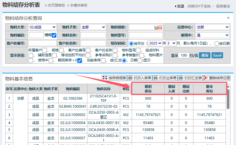 [點晴模切ERP]如何查看全廠各個倉庫中物料的庫存期初期末情況?