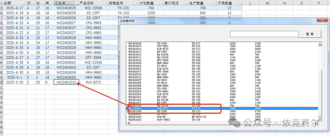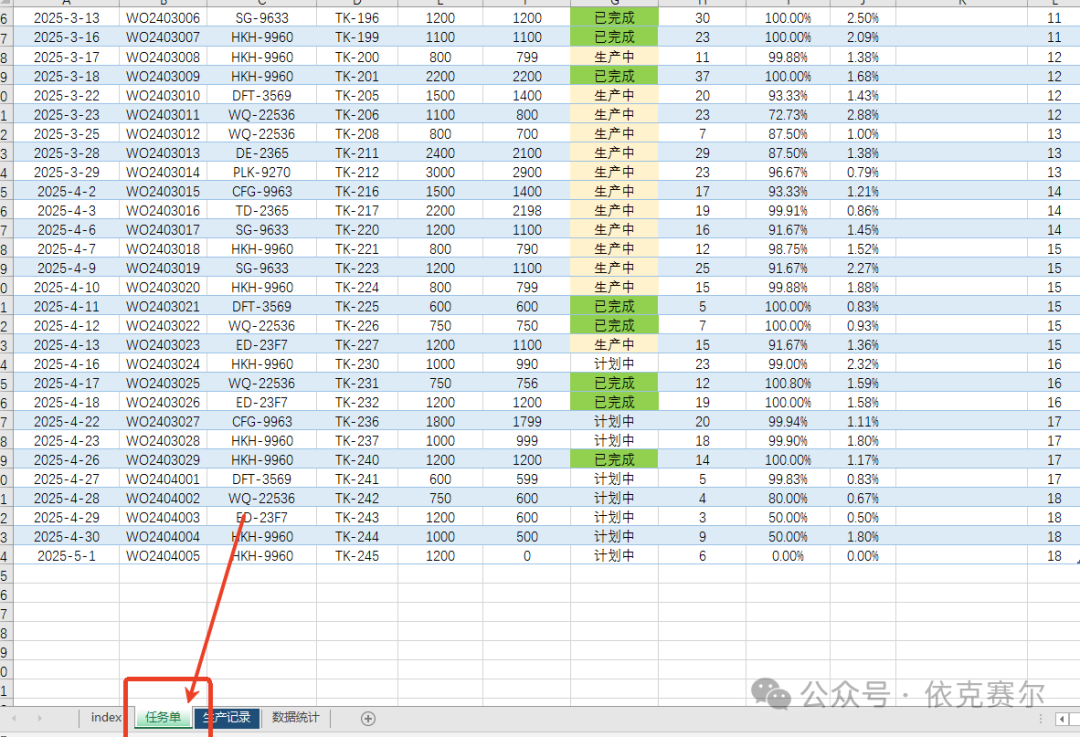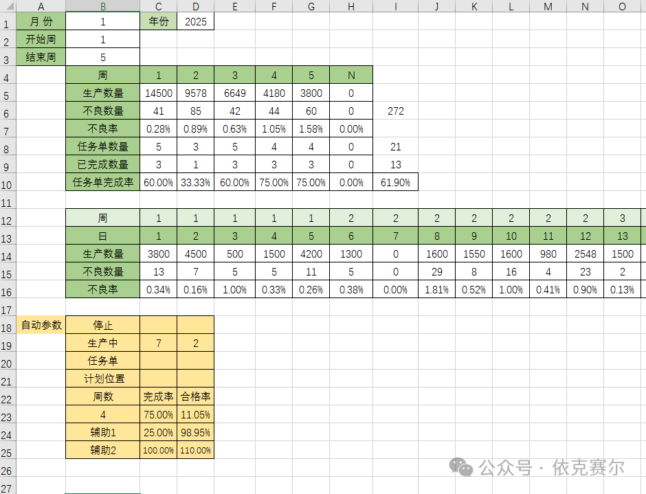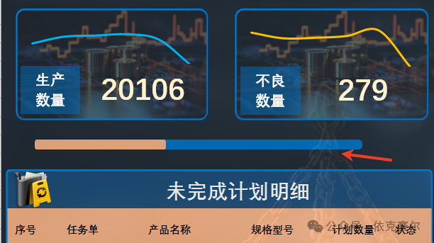 生產(chǎn)數(shù)據(jù)可視化看板 生產(chǎn)數(shù)據(jù)可視化看板3.5:生產(chǎn)數(shù)據(jù)可視化看板是一種直觀、高效的工具,旨在幫助企業(yè)實(shí)時監(jiān)控和分析生產(chǎn)過程中的關(guān)鍵數(shù)據(jù)。通過將復(fù)雜的生產(chǎn)數(shù)據(jù)轉(zhuǎn)化為圖表、動態(tài)圖形,管理者能夠快速掌握生產(chǎn)線的運(yùn)行狀態(tài)、設(shè)備效率、產(chǎn)品質(zhì)量以及資源消耗等核心指標(biāo)??窗逯С侄嗑S度數(shù)據(jù)分析,幫助識別生產(chǎn)瓶頸、優(yōu)化資源配置、提升生產(chǎn)效率,并支持決策制定。無論是實(shí)時監(jiān)控還是歷史數(shù)據(jù)回溯,生產(chǎn)數(shù)據(jù)可視化看板都能為企業(yè)提供清晰、 actionable 的洞察,助力實(shí)現(xiàn)智能制造和精益生產(chǎn)的目標(biāo)。本期分享的生產(chǎn)數(shù)據(jù)可視化看板主要用于生產(chǎn)數(shù)據(jù)的實(shí)施更新和展示,并能實(shí)現(xiàn)一鍵循環(huán)展示生產(chǎn)任務(wù)狀態(tài)以及相關(guān)的生產(chǎn)數(shù)據(jù)等信息。 1、月份切換:數(shù)據(jù)看板可通過月份按鈕切換,切換后可查看對應(yīng)月份的數(shù)據(jù)。月份切換后看板對應(yīng)的統(tǒng)計數(shù)據(jù)自動切換到對應(yīng)月份。 2. 數(shù)據(jù)統(tǒng)計:看板看板頂端四個矩形框統(tǒng)計當(dāng)月對應(yīng)的數(shù)據(jù)信息,其中矩形框的折線圖表示當(dāng)月對應(yīng)每周的數(shù)據(jù)趨勢信息。 2.1 生產(chǎn)中任務(wù)單信息:看板中心位置顯示生產(chǎn)中的任務(wù)單信息,可通過右上方的向上和向下按鈕切換查看。當(dāng)前信息支持自動循環(huán)播放。 2.2 未完成計劃明細(xì):未完成計劃明細(xì)顯示當(dāng)月所有為完成狀態(tài)的任務(wù)單信息,當(dāng)前信息也可一鍵循環(huán)播放查看。 2.3 生產(chǎn)數(shù)量統(tǒng)計:圖表右下方通過柱狀圖的形式統(tǒng)計當(dāng)月每日生產(chǎn)數(shù)量。 2.4 環(huán)形圖:圖表右側(cè)通過兩個環(huán)形圖統(tǒng)計當(dāng)月每周的任務(wù)單完成率和生產(chǎn)合格率,且周數(shù)可根據(jù)需要自動循環(huán)切換。 3 自動循環(huán): 點(diǎn)擊月份按鈕右方的自動按鈕,狀態(tài)切換為“自動”看板信息可自動循環(huán)顯示當(dāng)月的數(shù)據(jù),數(shù)據(jù)按指定的時間循環(huán)切換。如不需要自動切換,點(diǎn)擊“停止”按鈕即可,狀態(tài)自動切換為停止。 3.1循環(huán)進(jìn)度:以進(jìn)度條的形式顯示循環(huán)的進(jìn)度。 4、任務(wù)單:新增任務(wù)單,只需要在任務(wù)單的工作表輸入對應(yīng)的任務(wù)單信息即可。任務(wù)單信息只需要輸入日期、任務(wù)單、產(chǎn)品名稱、規(guī)格型號和計劃數(shù)量和狀態(tài)即可,其他信息均可通過公式自動獲取 5 生產(chǎn)記錄:生產(chǎn)數(shù)據(jù)更新,在生產(chǎn)記錄的工作表錄入對應(yīng)信息即可。 5.1 日期錄入:在日期列雙擊空白工作表,可打開日期選擇窗口,實(shí)現(xiàn)日期的快速錄入。 5.2任務(wù)單信息:在任務(wù)單列雙擊空白單元格,可打開任務(wù)單信息選擇窗口,雙擊需要錄入放入的任務(wù)單信息后,自動添加到任務(wù)單信息錄入位置。只需要輸入生產(chǎn)數(shù)量和不良數(shù)量即可更新圖表。 6、數(shù)據(jù)統(tǒng)計:數(shù)據(jù)統(tǒng)計工作表的公式如無必要切勿修改。