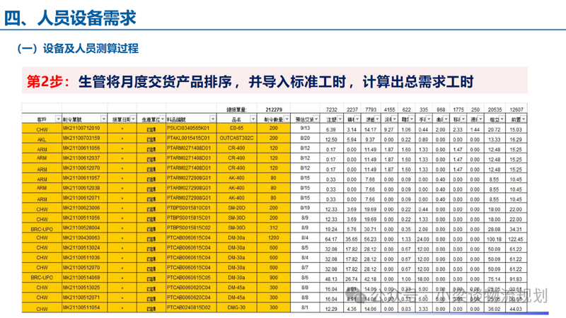 公式:所需人數(shù) = ∑(產(chǎn)品標(biāo)準(zhǔn)工時(shí) × 訂單量) / (每日工作時(shí)間 × 出勤率 × 效率系數(shù));