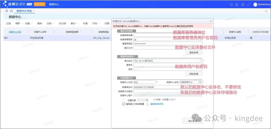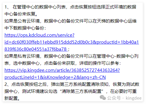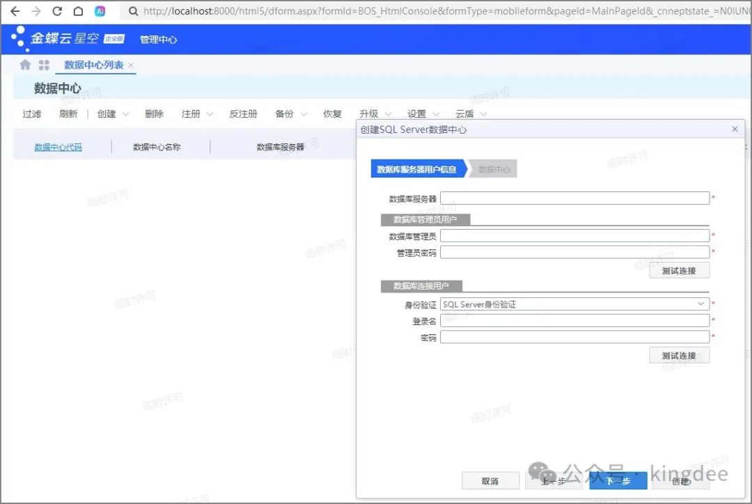 本文以安裝金蝶云星空V9企業(yè)版,并升級(jí)9.0.0.20241121版本為例,描述整個(gè)金蝶云星空測(cè)試環(huán)境的搭建過程,方便客戶更加快速準(zhǔn)確的搭建測(cè)試環(huán)境。 主要應(yīng)用場(chǎng)景為: 1、 金蝶云星空公有云環(huán)境搭建線下測(cè)試環(huán)境; 2、 補(bǔ)丁升級(jí)前,先搭建金蝶云星空測(cè)試環(huán)境測(cè)試升級(jí); 3、 開發(fā)、對(duì)接等測(cè)試需求下的金蝶云星空測(cè)試環(huán)境搭建。 2.金蝶云星空測(cè)試環(huán)境搭建過程2.1 下載金蝶云星空V9安裝包1、 DVD包下載路徑 點(diǎn)擊產(chǎn)品介紹說明,進(jìn)入產(chǎn)品詳細(xì)介紹頁(yè)面,點(diǎn)擊【下載安裝包】進(jìn)行安裝包下載。 2.2金蝶云星空安裝部署環(huán)境要求本文以硬件環(huán)境6C,32G,1TSSD,系統(tǒng)環(huán)境為windows server2016,sql server2012為例編寫(操作系統(tǒng)和數(shù)據(jù)庫(kù)安裝不在本文檔描述范圍,需要IT工程師先行部署)。硬件的推薦配置可以參考金蝶云星空DVD安裝包下,help文件夾中的產(chǎn)品安裝指南,獲取當(dāng)前版本支持的操作系統(tǒng)和數(shù)據(jù)庫(kù)版本信息。 2.3金蝶云星空安裝部署環(huán)境準(zhǔn)備1、服務(wù)器管理器中安裝IIS 和 .net4.8(V9版本之前.net4.5即可)、消息隊(duì)列。 1. IIS中除了FTP服務(wù)器之外,其他的功能建議都展開勾選安裝。 2. 自帶的.net4.x版本全部勾選安裝。 3. 在下方勾選消息隊(duì)列安裝。 4. 在安裝包中找到安裝包K3Cloud_DVD_9.0_ENT\OS_Default\vcredist_x64安裝vc_redist.x64.exe(如果操作系統(tǒng)自身不帶.net4.8,還需要在安裝包K3Cloud_DVD_9.0_ENT\OS_Default\DOTNETFX48中找到ndp48-x86-x64-allos-enu.exe進(jìn)行安裝)。 2.4金蝶云星空產(chǎn)品安裝1、運(yùn)行setup.exe安裝程序,進(jìn)入到安裝歡迎界面,點(diǎn)擊“開始”,進(jìn)入下一步安裝步驟。 2、錄入公司名稱,選擇安裝位置(可以自定義路徑,不要安裝在中文路徑下)。 3、下一步之后,會(huì)進(jìn)行環(huán)境檢測(cè),因?yàn)樵谥耙呀?jīng)安裝好必要的環(huán)境依賴,所以檢測(cè)基本可以通過,下圖中的2個(gè)可以忽略(安全軟件最好在安裝過程中退出,可能出現(xiàn)誤攔截的情況)。 4、點(diǎn)擊下一步,正式開始安裝。 5、安裝完成。 6、創(chuàng)建管理中心。 數(shù)據(jù)庫(kù)服務(wù)器:數(shù)據(jù)庫(kù)服務(wù)器的ip或者機(jī)器名。 數(shù)據(jù)庫(kù)管理員用戶:能連接數(shù)據(jù)庫(kù)服務(wù)器的管理賬號(hào)和密碼,一般為sa。 數(shù)據(jù)庫(kù)連接用戶:能連接數(shù)據(jù)庫(kù)服務(wù)器的一般賬號(hào)和密碼,可以同數(shù)據(jù)庫(kù)管理員用戶。 數(shù)據(jù)庫(kù)實(shí)體:系統(tǒng)自動(dòng)生成,該實(shí)體為管理數(shù)據(jù)庫(kù)的數(shù)據(jù)庫(kù)實(shí)體。 數(shù)據(jù)庫(kù)文件路徑:數(shù)據(jù)庫(kù)實(shí)體存放的本地路徑,點(diǎn)擊搜索按鈕會(huì)彈出數(shù)據(jù)庫(kù)服務(wù)器的文件路徑,根據(jù)自己的需要進(jìn)行設(shè)置。 數(shù)據(jù)庫(kù)日志文件路徑:日志庫(kù)存放的路徑,默認(rèn)設(shè)置成和數(shù)據(jù)庫(kù)文件路徑相同。 7、登錄管理中心并創(chuàng)建數(shù)據(jù)中心。 管理庫(kù)創(chuàng)建完成后,登錄管理中心,管理中心登錄賬號(hào)密碼默認(rèn)為:Administrator\888888。 進(jìn)入【數(shù)據(jù)中心列表】可進(jìn)行業(yè)務(wù)數(shù)據(jù)中心創(chuàng)建和維護(hù)(創(chuàng)建、刪除、注冊(cè)、反注冊(cè)、備份、恢復(fù)等)。 輸入數(shù)據(jù)庫(kù)服務(wù)器ip或者機(jī)器名,數(shù)據(jù)庫(kù)管理員賬號(hào),數(shù)據(jù)庫(kù)連接用戶(可以同管理數(shù)據(jù)中心創(chuàng)建),下一步輸入數(shù)據(jù)中心名稱,選擇數(shù)據(jù)庫(kù)實(shí)體存放路徑,進(jìn)行業(yè)務(wù)數(shù)據(jù)中心的創(chuàng)建。 2.5更新標(biāo)準(zhǔn)產(chǎn)品補(bǔ)丁2、補(bǔ)丁安裝依賴K3cloudManager服務(wù)(環(huán)境安裝完成后,該服務(wù)會(huì)自動(dòng)生成),檢查服務(wù)器是否正常啟動(dòng)。 3、 在管理中心服務(wù)器打開補(bǔ)丁包安裝文件。 4、 輸入管理中心登錄密碼,點(diǎn)擊確定。 5、 在彈出的確認(rèn)安裝框再次點(diǎn)擊確定開始安裝,等待安裝完成(補(bǔ)丁安裝過程,用戶無(wú)法正常使用星空系統(tǒng))。 到這里,星空標(biāo)準(zhǔn)功能已經(jīng)安裝完成并升級(jí)到了目前最新的9.0.0.20241121版本。 如果有二開功能部署,建議咨詢二開工程師,是否部署補(bǔ)丁或者直接拷貝對(duì)應(yīng)的二開dll文件到website\bin目錄。 3. 恢復(fù)數(shù)據(jù)中心備份3、如何恢復(fù)數(shù)據(jù)中心的截圖如下: 等待恢復(fù)完成之后,登陸客戶端或者瀏覽器選擇對(duì)應(yīng)的數(shù)據(jù)中心訪問。 4 申請(qǐng)臨時(shí)許可并引入在云平臺(tái)申請(qǐng)臨時(shí)許可,但僅限3個(gè)用戶,單次申請(qǐng)有效期3個(gè)月,申請(qǐng)時(shí)企業(yè)需要是已認(rèn)證狀態(tài)。 超過3哥用戶的臨時(shí)許可申請(qǐng),請(qǐng)聯(lián)系當(dāng)?shù)亟鸬こ處焻f(xié)助。 獲取3個(gè)用戶的臨時(shí)許可申請(qǐng)如下步驟: 2、 點(diǎn)【下載試用許可】。 3、 選擇和安裝產(chǎn)品符合的許可(不能選擇公有云)。 4、 輸入軟件特征碼。特征碼可以從管理中心的軟