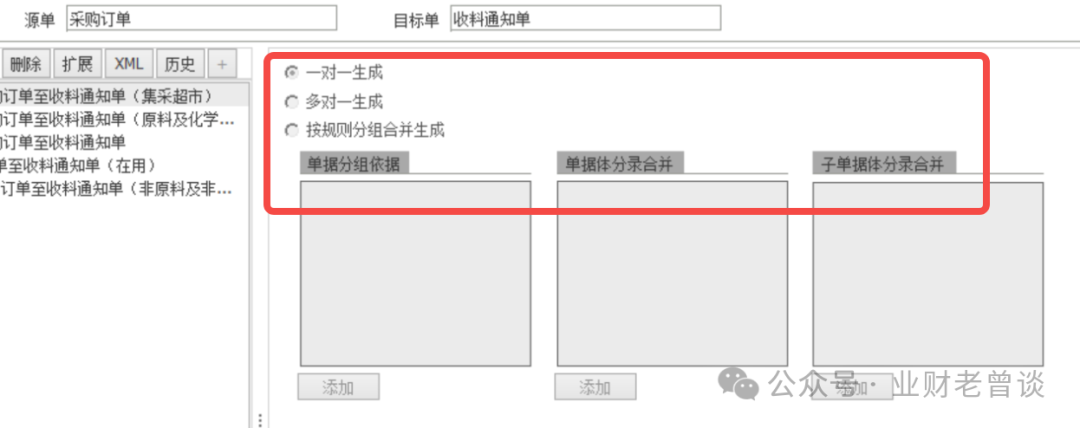 c.分組策略,配置源單批量下推生成目標(biāo)單時(shí)采用的單據(jù)分組依據(jù)、分錄合并依據(jù),比如將多個(gè)《采購申請單》按同一“組織、供應(yīng)商”分組(合并)生成一個(gè)目標(biāo)《采購訂單》 ;