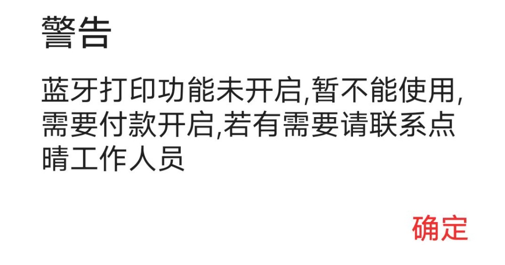 點(diǎn)晴模切ERP-彈出提示:藍(lán)牙打印功能未開啟,暫不能使用,需要付款開啟,若有需要請(qǐng)聯(lián)系點(diǎn)晴工作人員