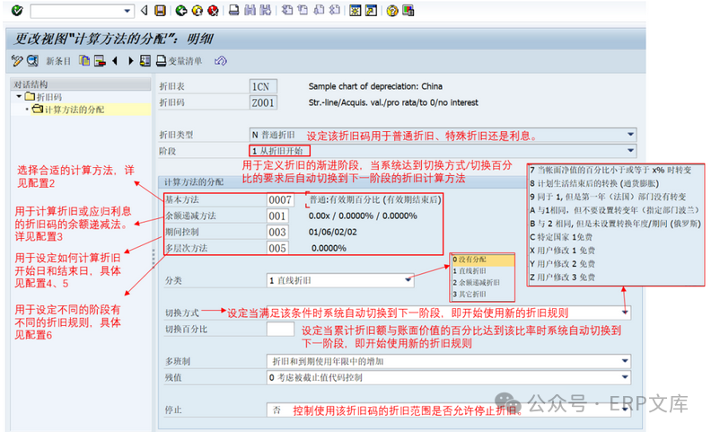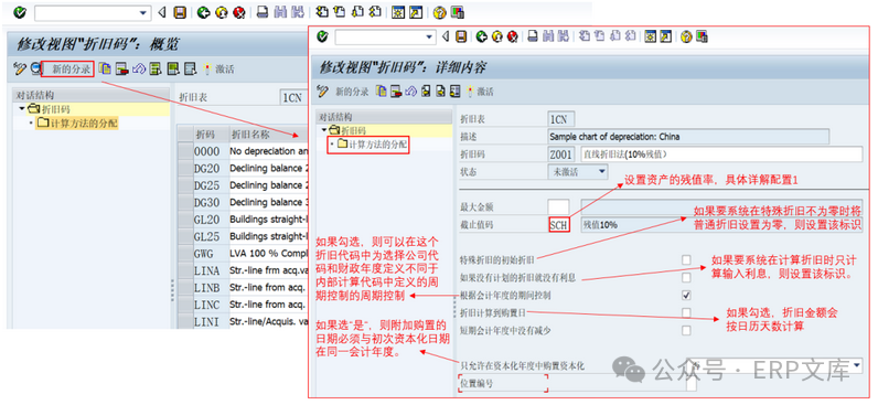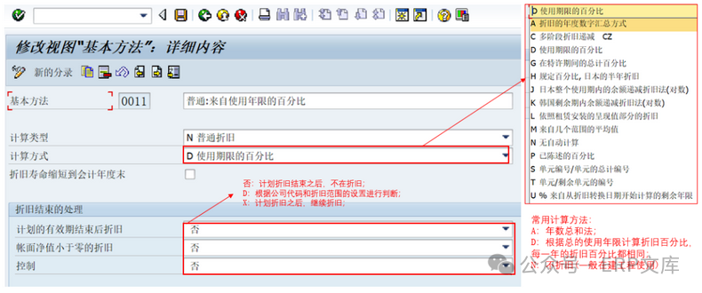 在SAP系統(tǒng)中,固定資產(chǎn)折舊碼是用于定義和控制固定資產(chǎn)折舊方式的重要工具,其功能和用途主要包括以下幾個(gè)方面: 它的主要功能如下:1、定義折舊方法折舊碼可以指定固定資產(chǎn)采用的折舊方法,如直線折舊法、雙倍余額遞減法、年數(shù)總和法等。這些方法通過折舊碼與資產(chǎn)相關(guān)聯(lián),從而確定資產(chǎn)的折舊計(jì)算方式。2、設(shè)置折舊期間控制折舊碼可以定義資產(chǎn)折舊的起始期間,例如購置當(dāng)月開始折舊(01)或購置下月開始折舊(11)。這種設(shè)置通過期間控制代碼實(shí)現(xiàn),確保折舊計(jì)算符合企業(yè)的會計(jì)政策。3、多層方法配置折舊碼支持多層次方法的配置,允許企業(yè)根據(jù)需要選擇按年、按月或按季折舊,并決定折舊更新的具體值。4、基值選擇折舊碼可以指定折舊計(jì)算的基值,如購置價(jià)值(01)、重置價(jià)值(03)或賬面凈值(24)。不同的基值選擇會影響折舊額的計(jì)算。5、特殊折舊處理 折舊碼支持特殊折舊和計(jì)劃外折舊的設(shè)置,這些折舊方式可以獨(dú)立于普通折舊進(jìn)行計(jì)算,但只影響資產(chǎn)凈值。 下面具體介紹下SAP固定資產(chǎn)模塊如何配置折舊碼 配置路徑:IMG->財(cái)務(wù)會計(jì)->資產(chǎn)會計(jì)核算->折舊->評估方法->折舊碼->維護(hù)折舊碼(AFAMA) 雙擊【計(jì)算方法的分配】 下面對折舊碼關(guān)聯(lián)的截止值碼、基本方法、余額遞減方法、期間控制、多層次方法的功能配置進(jìn)行具體說明 配置2:定義基本方法 定義折舊方式(普通折舊、稅法折舊 ), 賬面價(jià)值小于0時(shí)是否繼續(xù)折舊等。 配置路徑:IMG->財(cái)務(wù)會計(jì)->資產(chǎn)會計(jì)核算->折舊->評估方法->折舊碼->計(jì)算方法->定義基本方法 備注:計(jì)劃的有效期結(jié)束后折舊、賬面凈值小于零的折舊、控制一般都設(shè)置否。