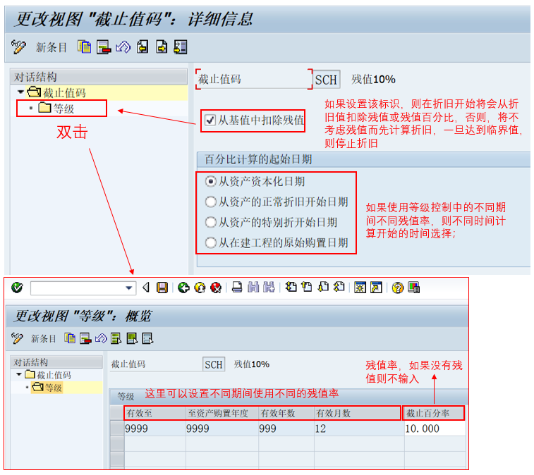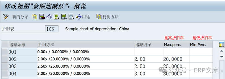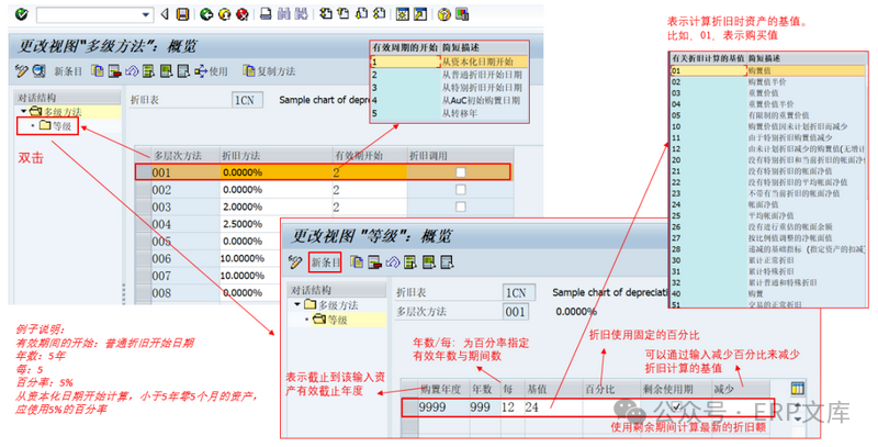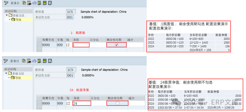 基于公司代碼+折舊范圍設(shè)置上面3個(gè)邏輯的配置點(diǎn): 配置3:定義余額遞減法 配置路徑:IMG->財(cái)務(wù)會計(jì)->資產(chǎn)會計(jì)核算->折舊->評估方法->折舊碼->計(jì)算方法->定義余額遞減方法 遞減因子:乘數(shù)因子用來確定余額遞減折舊的折舊百分率。系統(tǒng)讓該因子和由總使用年限產(chǎn)生的折舊百分率相乘。 最高折舊率:這是折舊百分率的上限。如果要從使用年限、乘數(shù)因子或要折舊的單位數(shù)量中生成更高的折舊百分率,那么系統(tǒng)使用在此指定的最大百分率。 最小百分比率:折舊百分率的下限。如果從使用年限、乘數(shù)因子或要折舊的單位數(shù)量中生成下限百分率,那么系統(tǒng)使用在此指定的最小百分比。舉例說明:一資產(chǎn)折舊率為12%,按照雙倍余額遞減法,則其折舊率為24%,但是此處配置的最大折舊率為20%,則表示該資產(chǎn)最多使用20%去進(jìn)行折舊。而上圖中的001,遞減因?yàn)闉榭?,則表示按照資產(chǎn)原有折舊率進(jìn)行折舊。配置4:定義期間控制配置6:定義多層次方法 配置路徑:IMG->財(cái)務(wù)會計(jì)->資產(chǎn)會計(jì)核算->折舊->評估方法->折舊碼->計(jì)算方法->定義多層次方法 基值 + 剩余使用期的組合對應(yīng)的折舊計(jì)算邏輯 配置7:定義日歷分配