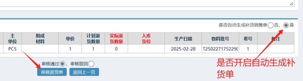 ?審核時注意是否要自動生成補貨單,最后點擊審核退貨單按鈕