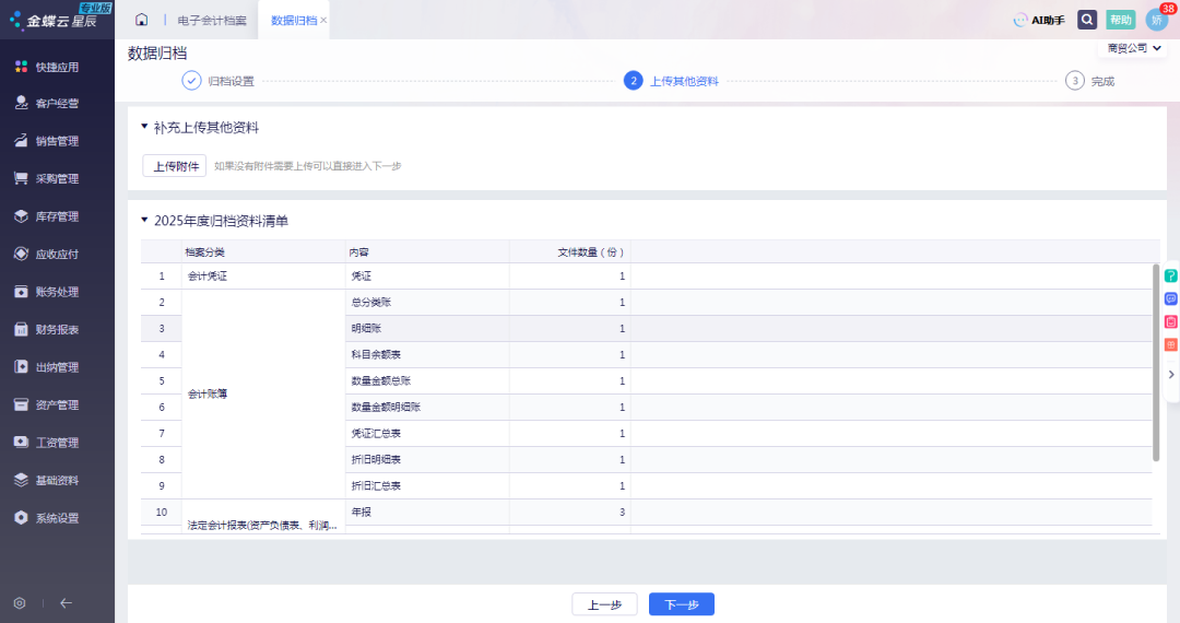 1.登錄軟件后,基礎(chǔ)資料--電子會計檔案--新建檔案,即可進入操作界面。2.根據(jù)需要選擇要歸檔的年度、數(shù)據(jù)項目,選擇下一步完成即可。3.完成歸檔后,稍等會即可下載歸檔文件,解壓下載文件可查詢明細數(shù)據(jù)。ps:如需審計導(dǎo)出AIS文件請點文章第2張圖片右上角進去操作。