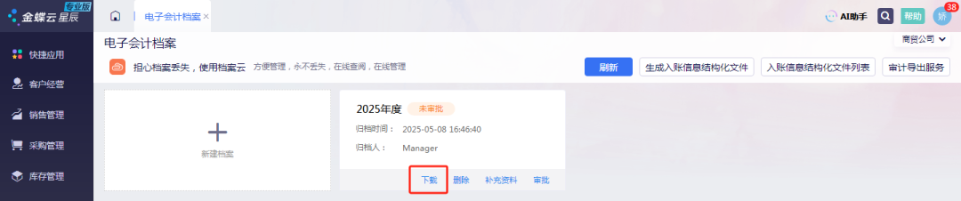 金蝶云·星辰電子會計檔案,可以讓用戶對已年度結(jié)賬的財務(wù)數(shù)據(jù)(憑證、會計賬簿、法定報表等)進行歸檔整理,系統(tǒng)會按年度生成PDF格式的電子文檔,可下載下來,方便后續(xù)查詢、追溯、打印等。金蝶云·星辰標準版、專業(yè)版、旗艦版均支持此功能。