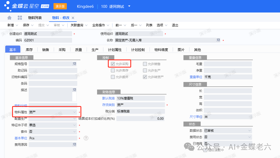 物料屬性:需為"外購(gòu)"且勾選"允許資產(chǎn)",如下圖所示