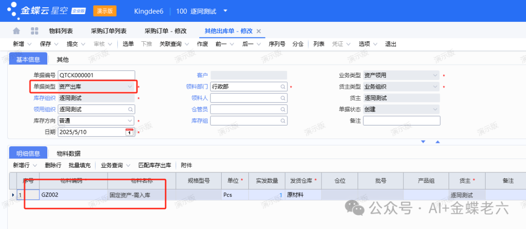 在【庫(kù)存管理】中新增【其他出庫(kù)單】→單據(jù)類型選擇"資產(chǎn)出庫(kù)"→填寫必填項(xiàng)→保存提交審核,如下圖所示。