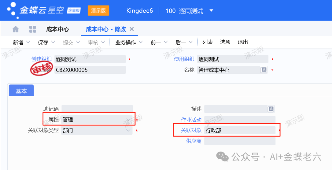 成本中心屬性為管理,只能關(guān)聯(lián)部門屬性為管理部門的部門,如下圖所示: