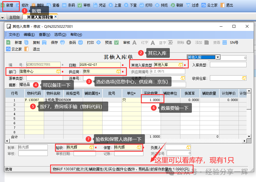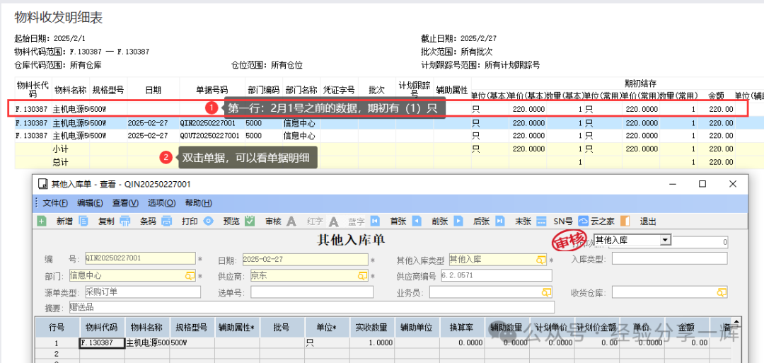 上篇講的是金蝶k3的(采購(gòu)入庫(kù)后的退貨)操作,詳細(xì)講解請(qǐng)點(diǎn)開(kāi)鏈接自己看看,從零開(kāi)始學(xué)金蝶k3(二) 這篇講的是金蝶k3的 (倉(cāng)存管理) 我們還是一樣,分三步講解: 1.倉(cāng)庫(kù)入庫(kù)和出庫(kù)流程。 2.出入庫(kù)金蝶k3操作。 3.倉(cāng)庫(kù)常用查詢(xún)操作。 先講個(gè)簡(jiǎn)單版本的操作,具體和自己的公司流程有關(guān)。 倉(cāng)庫(kù)入庫(kù)流程: 正常采購(gòu)的物品,走采購(gòu)流程(采購(gòu)申請(qǐng)單)——(采購(gòu)訂單)——(外購(gòu)入庫(kù)單)具體操作,看從零開(kāi)始學(xué)金蝶k3(一)?(采購(gòu)入庫(kù)篇) 有些贈(zèng)送的物品,沒(méi)價(jià)格的,我們一般是走(其它入庫(kù)單)入系統(tǒng)倉(cāng)庫(kù),這樣可以直接區(qū)分出物品來(lái)源,也可走采購(gòu)入庫(kù)流程,入0元的價(jià)格,這個(gè)看自己公司怎么操作。 倉(cāng)庫(kù)出庫(kù)流程: 先是領(lǐng)用部門(mén)走個(gè)(領(lǐng)料或領(lǐng)貨)流程,看自己公司怎么規(guī)定,有的是走紙質(zhì)單,部門(mén)領(lǐng)導(dǎo)簽名,再去(倉(cāng)庫(kù))領(lǐng)東西;有的公司走OA單(釘釘、企業(yè)微信等),審批完后,直接去(倉(cāng)庫(kù))領(lǐng)東西。倉(cāng)庫(kù)出庫(kù)后,金蝶k3系統(tǒng),錄個(gè)(其它出庫(kù)單),物品出庫(kù)完成。 金蝶k3(其它入庫(kù)單)操作 舉例:我們還是用上節(jié)講的物品(主機(jī)電源500W :編碼F.130387),入庫(kù)1個(gè)電源。 供應(yīng)鏈——倉(cāng)庫(kù)管理——驗(yàn)收入庫(kù)——(其他入庫(kù)-維護(hù)) 用(維護(hù))模塊,選過(guò)濾條件,最好是選(全部)。 在維護(hù)介面,新增(其他入庫(kù)單); 其他入庫(kù)類(lèi)型:其他入庫(kù); 選必選項(xiàng):部門(mén)和供應(yīng)商; 摘要:可以備注一下信息; 物料代碼:按F7查詢(xún),或直接手輸代碼; 實(shí)收數(shù)量:填一下(入庫(kù)1個(gè)); 驗(yàn)收和保管人:選擇一下; 備注:最下面這里會(huì)顯示該物品的庫(kù)存。 保存——審核,單據(jù)生效,現(xiàn)在庫(kù)存變2個(gè),入庫(kù)完成。 金蝶k3(其它出庫(kù)單)操作 舉例:信息中心領(lǐng)用(主機(jī)電源500W )1個(gè)。 供應(yīng)鏈——倉(cāng)庫(kù)管理——領(lǐng)料發(fā)貨——(其他出庫(kù)-維護(hù)) 同樣:用(維護(hù))模塊,選過(guò)濾條件,最好是選(全部) 維護(hù)介面,新增(其他出庫(kù)單); 其他入庫(kù)類(lèi)型:其他出庫(kù); 選必選項(xiàng):部門(mén)和領(lǐng)料人; 用途:可以備注一下信息; 物料代碼:按F7查詢(xún),或直接手輸代碼; 領(lǐng)用數(shù)量:填一下(領(lǐng)用1個(gè)); 即時(shí)庫(kù)存:顯示該物品的庫(kù)存; 發(fā)貨人:選擇一下; 保存——審核,單據(jù)生效,現(xiàn)在庫(kù)存變1個(gè),出庫(kù)完成。 倉(cāng)庫(kù)常用查詢(xún)操作 用的最多的是(物料收發(fā)明細(xì)表)。 倉(cāng)庫(kù)管理——報(bào)表分析——(物料收發(fā)明細(xì)表) 舉例:查詢(xún)物品(主機(jī)電源500W :編碼F.130387),二月的明細(xì)。過(guò)濾條件:選日期和物料代碼,這樣查詢(xún)出來(lái)最快最簡(jiǎn)潔。注意:下面三個(gè)(不顯示)不要勾選,不然有時(shí)查詢(xún)的數(shù)據(jù)會(huì)不全。 報(bào)表怎么看: 第一行:顯示期初數(shù)量,顯示2月1號(hào),系統(tǒng)庫(kù)存(1只)。 第二行:?jiǎn)螕?jù)(QIN20250227001),可以雙擊單據(jù),顯示明細(xì);(第二行雙擊后,出現(xiàn)單據(jù)明細(xì):其他入庫(kù)單) 第三行:?jiǎn)螕?jù)(QOUT20250227001),雙擊可以看明細(xì); 因?yàn)槊骷?xì)太長(zhǎng)了,向右拉,顯示(收入和發(fā)出),第二行:收入1只;第三行:發(fā)出也是1只; 看最右邊的結(jié)存會(huì)清晰些,哪行不明白可以(雙擊哪行,會(huì)彈出單據(jù)明細(xì)),我怕我講不明白,大家自己多操作幾次,看看就知道了。 總結(jié)一下 這章講的是(倉(cāng)存管理)里最簡(jiǎn)單的操作(入庫(kù),出庫(kù),結(jié)存),單據(jù)操作都差不多,核心的點(diǎn)是學(xué)會(huì)查看報(bào)表:(過(guò)濾條件的選擇和看懂報(bào)表顯示的數(shù)據(jù)),過(guò)濾條件選擇的越明細(xì),我們出來(lái)的報(bào)表數(shù)據(jù)就越簡(jiǎn)潔。 下章來(lái)個(gè)高級(jí)版的(流程圖) 閱讀原文:原文鏈接 點(diǎn)晴模切ERP更多信息:http://moqie.clicksun.cn,聯(lián)系電話(huà):4001861886 該文章在 2025/5/28 10:27:38 編輯過(guò) |