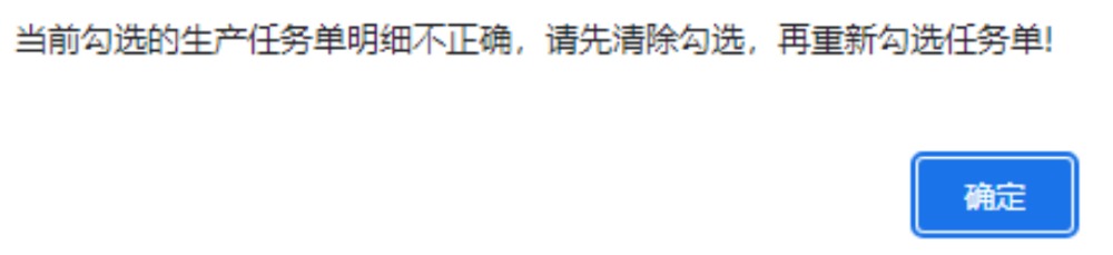 點(diǎn)晴模切ERP-彈出提示:當(dāng)前勾選的生產(chǎn)任務(wù)單明細(xì)不正確,請(qǐng)先清除勾選,再重新勾選任務(wù)單!