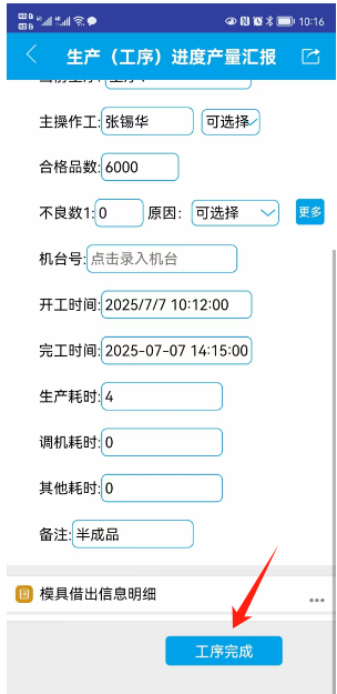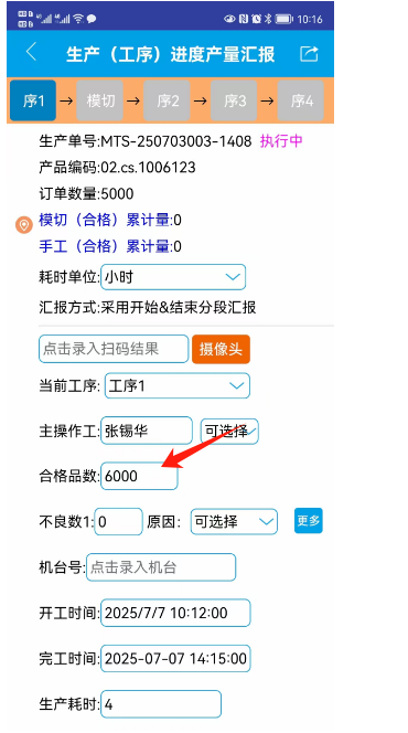 注意:開(kāi)始計(jì)時(shí)匯報(bào),無(wú)需填寫(xiě)數(shù)量,機(jī)臺(tái)等信息 操作完后,等工序完成,重復(fù)操作上述步驟再次進(jìn)入界面