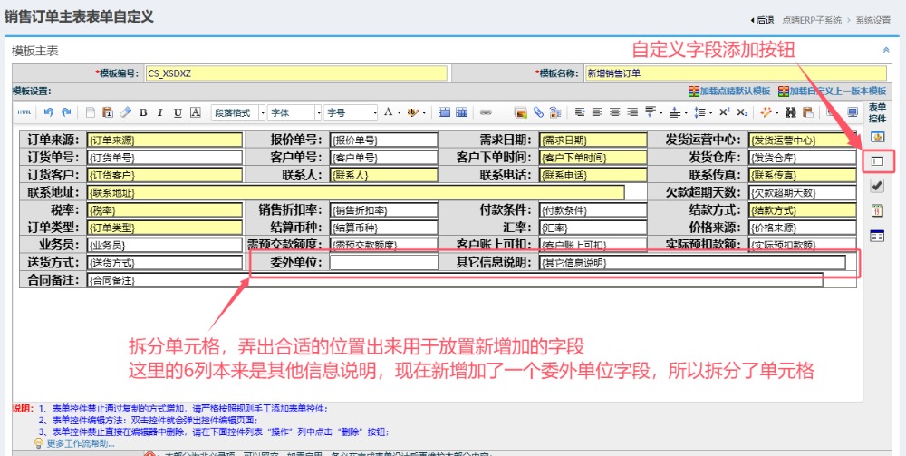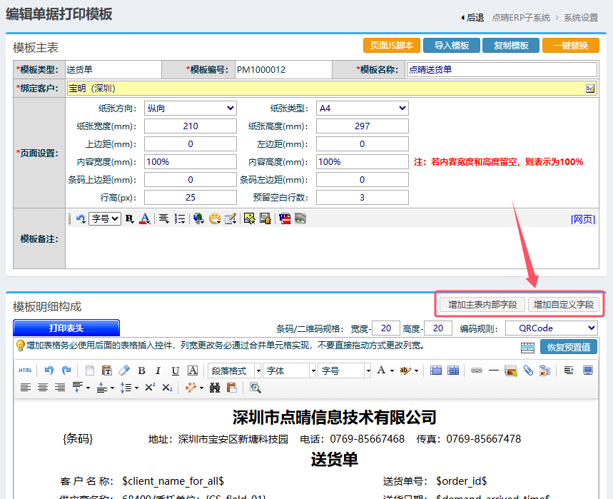 在打印模板設(shè)置頁面中,提供了兩個增加自定義字段的按鈕:增加主表內(nèi)部字段、增加自定義字段。