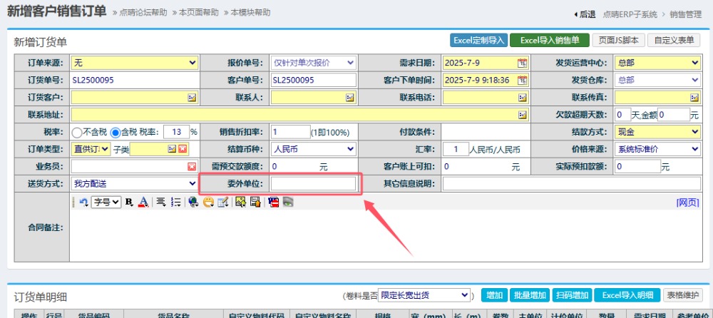 以上就可以對銷售訂單主表增加自定義字段了,重新進入銷售訂單新增頁面,就會看到多了一個字段“委外單位”: