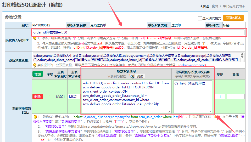 在“主表字段取數(shù)SQL”中,取數(shù)SQL語句設(shè)置為“select TOP (1) scm_client_order_contract.CS_field_01 from scm_deliver_goods_order_list LEFT OUTER JOIN scm_client_order_contract ON scm_deliver_goods_order_list.contract_id = scm_client_order_contract.contract_id where scm_deliver_goods_order_list.order_id= '{order_id}'”;