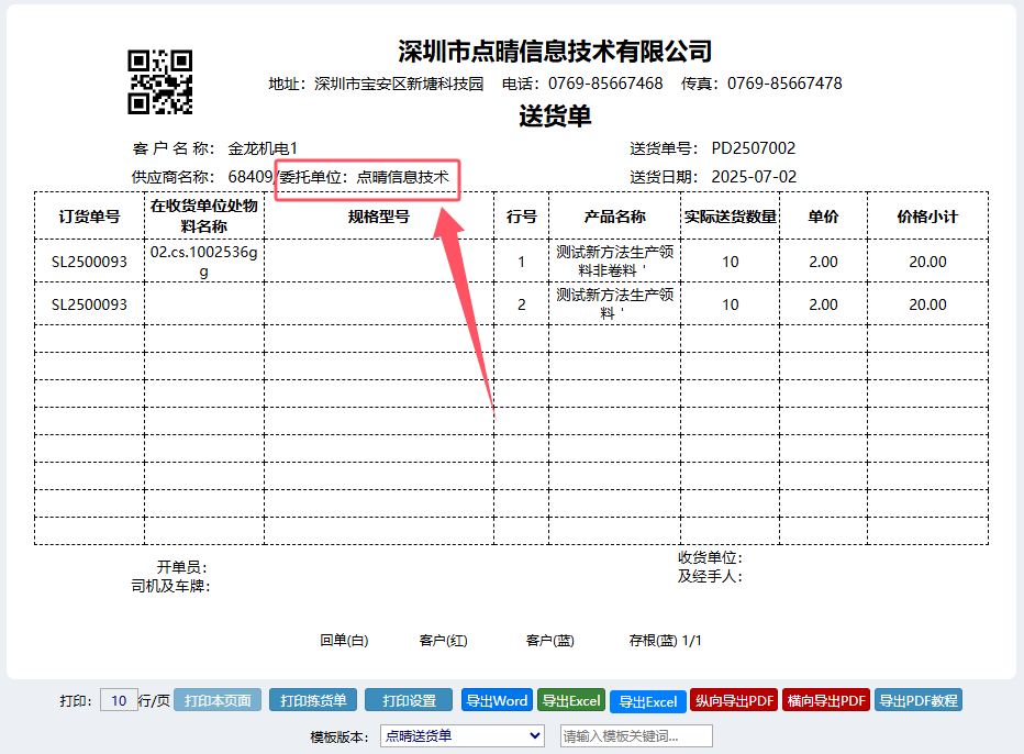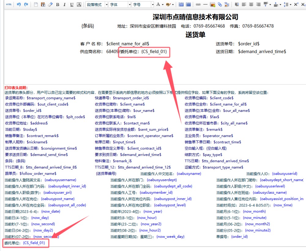 ?就會看到下面多了一個“委托單位:{CS_field_01}”,將其放到打印模板上適當(dāng)位置,打印時,就會看到多了這個自定義字段了: