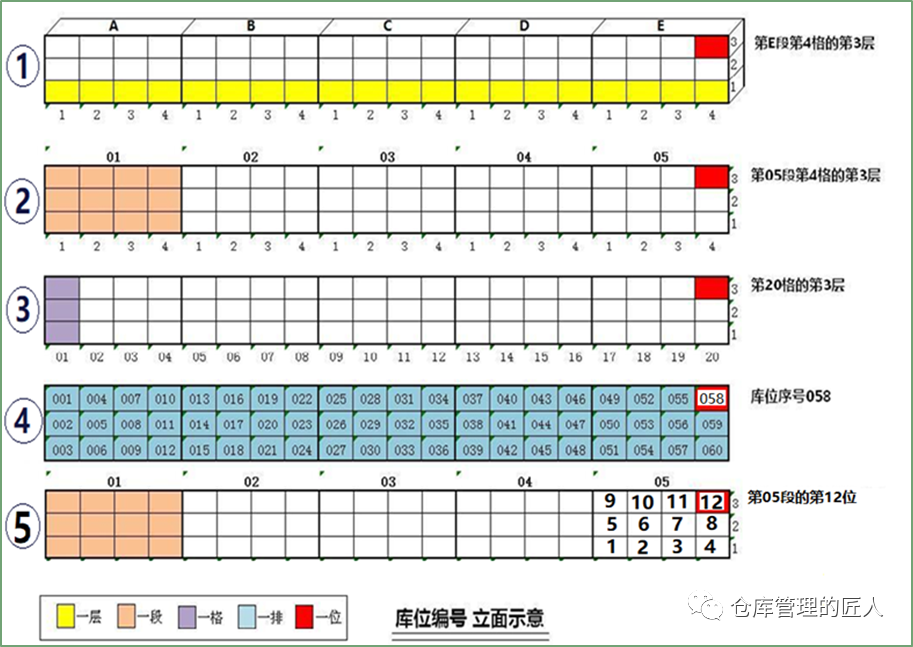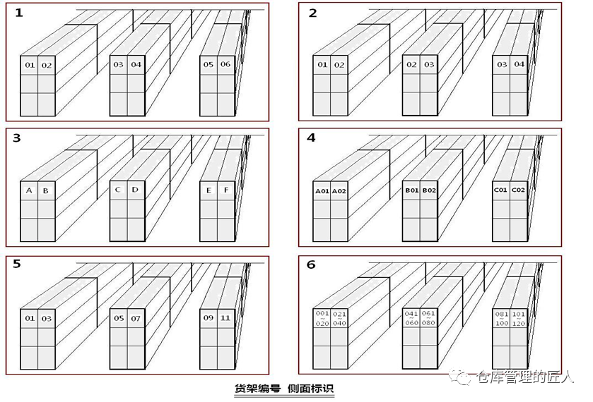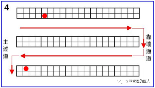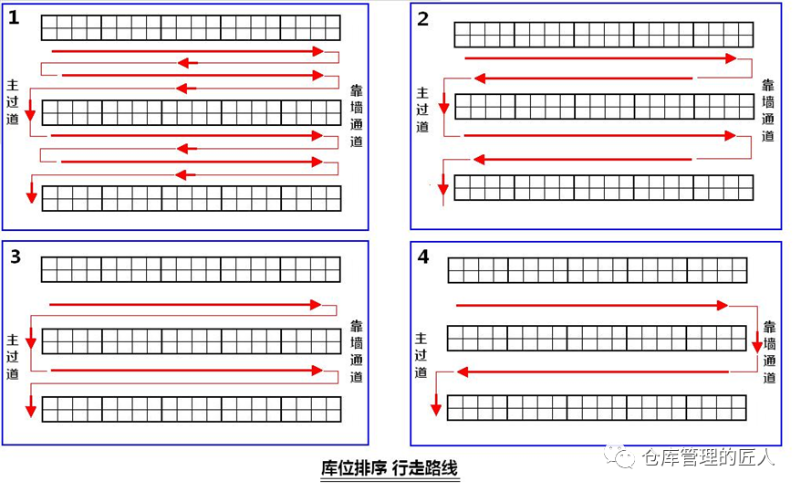 2.5 存儲(chǔ)位(以存儲(chǔ)平時(shí)配貨動(dòng)不到的貨品為主)、揀貨位(平時(shí)揀貨,配貨優(yōu)先,方便取貨的庫位) 2.6 A類庫位(取貨放貨非常方便的庫位)、B類庫位(取貨放貨方便度一般)、C類庫位(取貨放貨方便最差的庫位)我們?cè)诰S護(hù)庫位信息數(shù)據(jù)庫的時(shí)候,下面這些信息盡量維護(hù)齊全:1.地區(qū);2.樓棟;3.樓層;4.區(qū)域;5.移動(dòng)/固定;6.巷道;7.排;8.組;9.格;10.層;11.長(zhǎng)/寬;12.高;13.進(jìn)深;14.承重;15.可用高度;16.可用容積;17.溫度區(qū)間;18.離地高度;19.離主通道距離;20.取貨便利性;21.存貨SKU限制;22.是否限定品類;23.拆分庫位數(shù);24.上級(jí)庫位;25.庫位序號(hào)/簡(jiǎn)碼;26.庫位的中文全稱;27.上架優(yōu)先順序;28.揀貨優(yōu)先順序等。我們可以根據(jù)這些信息來判斷、分析,哪些庫位取放貨方便,哪些庫位適合存儲(chǔ)什么貨品;哪些庫位先當(dāng)先用,哪些庫位后用;哪些庫位適合什么季度使用等。我們先來看個(gè)示意圖,同樣的貨架,同樣的一個(gè)位置,但在不同的倉庫,卻有著不同的編碼規(guī)則。不同的企業(yè)倉庫庫位編碼有著不同的方法,沒有社會(huì)標(biāo)準(zhǔn),也沒有行業(yè)標(biāo)準(zhǔn),大家都認(rèn)為適合自己的就好。事實(shí)上大企業(yè)與小企業(yè),大倉庫與小倉庫,幾十個(gè)倉庫與只有一個(gè)倉庫,庫位編碼的規(guī)則確實(shí)是不一樣的。有的時(shí)候我們的庫位編碼,需要體現(xiàn):地區(qū)碼、倉庫碼、區(qū)域碼、排號(hào)(或巷道號(hào))、組號(hào)、格號(hào)、層號(hào),但有的時(shí)候不需要。比如說有些倉庫較小,整個(gè)倉庫也就500個(gè)庫位左右,那我們就可以直接用A001到A500就可以,不需要在庫位編碼上體現(xiàn)什么區(qū)域,什么排,什么格,哪一層,只需要在庫位基礎(chǔ)信息數(shù)據(jù)庫中體現(xiàn)。這里的“A”可以是倉庫的代碼,也可以是區(qū)域的代碼。如果倉庫較多,庫區(qū)面積較大,且?guī)煳惠^多,庫位又分為不同的庫區(qū)和類型,達(dá)到數(shù)萬,那么我們就要體現(xiàn)區(qū)域和排號(hào),以及組號(hào),層號(hào)。無論編碼是什么規(guī)則,總而言之,字段上最好不要超過10位數(shù),中間的杠最好不要超過3個(gè)。對(duì)于全國性的倉庫編碼,庫位編碼中間的杠也盡量不要超過4個(gè),且?guī)煳粯?biāo)識(shí)上該放大的信息要放大。現(xiàn)實(shí)中,我們最怕的就是教條化,不能靈活變通。無論什么倉庫,我們?cè)谧鰩煳痪幋a的時(shí)候,盡量考慮以下幾點(diǎn):A).力求字段數(shù)最少,只要能表達(dá)意義,能簡(jiǎn)則簡(jiǎn);B).要考慮員工的行走路徑和識(shí)別習(xí)慣;比如說:?jiǎn)T工面對(duì)一組貨架的時(shí)候,左邊是小號(hào),右邊是大號(hào),下面是小號(hào),上面是大號(hào),那么整個(gè)公司所有倉庫,都盡量是這個(gè)原則,因?yàn)閱T工時(shí)間長(zhǎng)了會(huì)形成習(xí)慣,如果庫位排序規(guī)則不一樣就會(huì)影響判斷,甚至出錯(cuò)。也就是說,如果增加或減少(貨架)庫位,那么新增的庫位編碼會(huì)不會(huì)帶來什么影響。如果因?yàn)榈截浟吭黾踊驕p少,現(xiàn)有庫位需要組合成大庫位,要拆分成小庫位,好不好辦。D).員工不需要看的信息,意義不大的信息盡量不要體現(xiàn)在庫位編碼字段上。我們?cè)趲煳痪幋a和庫位標(biāo)簽打印的時(shí)候,要盡量避免類似下面這兩種情況:上圖中第1種情況存在問題是庫位編碼顯得復(fù)雜,字段較多,同時(shí)在打印的時(shí)候不顯目,條碼也小,不方便掃描;上圖中第2種情況是庫位編碼字段當(dāng)中沒有用杠“—”區(qū)分,字?jǐn)?shù)多,容易讓人看花眼,好在打印標(biāo)識(shí)的時(shí)候,在左邊加上了中文注明。5)庫位編碼對(duì)揀貨路徑和揀貨距離的影響:由于我們平時(shí)在倉庫中配貨是根據(jù)庫位的排序進(jìn)行揀貨,那不同的庫位編碼規(guī)則就會(huì)有不同的庫位排序。如果編庫位的時(shí)候,是以排為單位,大多會(huì)出現(xiàn)下面的路線1;以巷道為單位,“左單右雙”編庫位,大多會(huì)出下面的路線2;有的倉庫同一巷道是按U字形順序編排庫位,就會(huì)形成下面的路線3。總的來說,第2種路線相對(duì)會(huì)好一些。但需要注意的是,電商倉庫與非電商倉庫(如傳統(tǒng)制造業(yè)、2B倉庫)在編排庫位時(shí)要求并不一樣。雖然庫位排序路徑可能最短,但實(shí)際上個(gè)別庫位揀貨與大多庫位揀貨產(chǎn)生的路徑是不一樣的。可能看完上圖,很多人都會(huì)認(rèn)為第4種路線編排庫位是最好的,但并不是,為什么呢?如果不是每個(gè)庫位都需要揀貨,那么人員在揀貨時(shí),走的路徑就比較靈活。如下圖:因?yàn)槿绻枰獟浀闹挥屑t色標(biāo)注的這2個(gè)庫位,請(qǐng)問我們還需要按箭頭顯示的路線行走嗎?肯定不需要。所以只有在一個(gè)巷道大多庫位需要揀貨時(shí),我們這樣的設(shè)計(jì)才是最好的,否則就不一定好。當(dāng)然,第1種路線肯定不好,但實(shí)際上很多企業(yè)只要是以排為單位編庫位就是第1種行走路線??偟膩碚f,庫位設(shè)計(jì),按第3種路線是相對(duì)較好的一種!如果我們一組貨架或一個(gè)庫位,只存儲(chǔ)一種貨品,我們可以稱這組貨架或這個(gè)庫位為“A001”,但如果這組貨架或這個(gè)庫位放了多種貨品,那我們就可以將這組貨架各個(gè