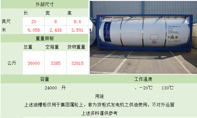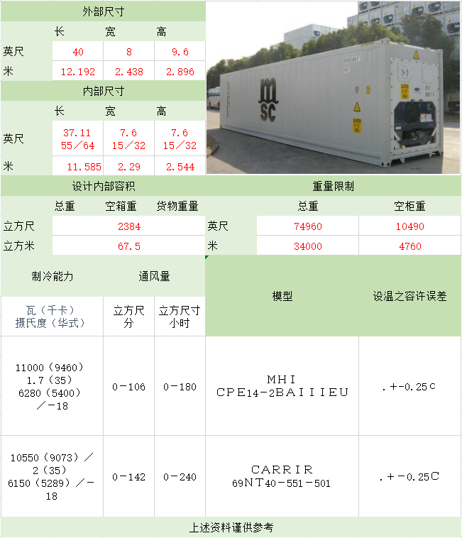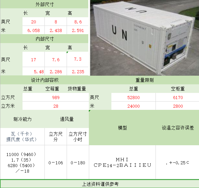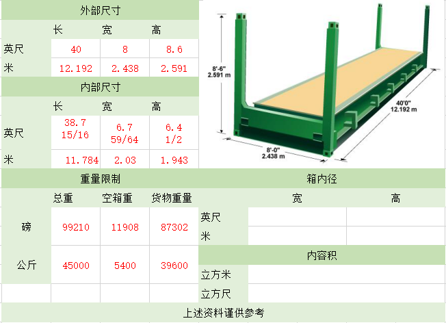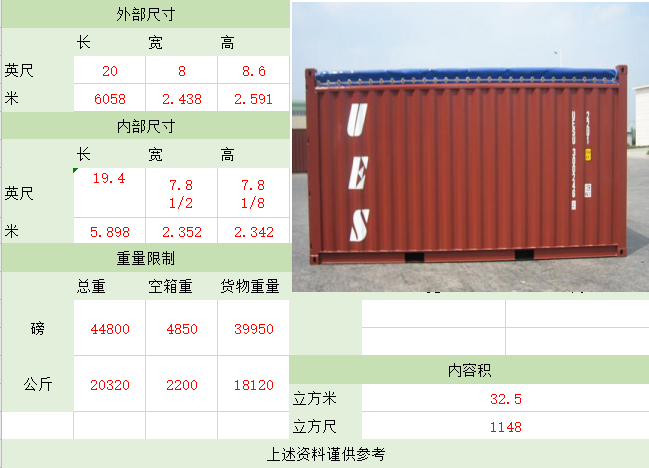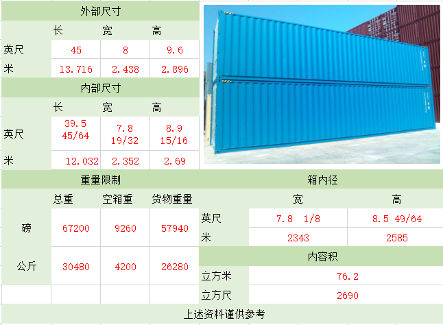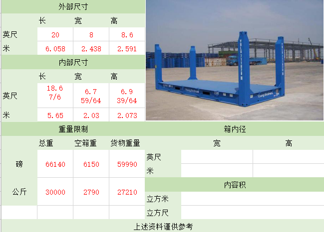 照片名稱:20'GP(General Purpose Containe) 備注:正常裝貨28CBM 照片名稱:40'GP(General Purpose Containe) 備注:正常裝貨56CBM 照片名稱:40'HQ(High Cube Container 高柜) 照片名稱:45'HQ(High Cube Container 高柜) 備注:正常裝貨78CBM 照片名稱:20'OT(Open Top開(kāi)頂) 照片名稱:40'OT(Open Top開(kāi)頂) 照片名稱:20'FR(Flat Rack角柱式折迭平板) 備注:大型機(jī)械、游艇、鍋爐等 照片名稱:40'FR(Flat Rack角柱式折迭平板) 照片名稱:40'FR(Flat Rack板框式折迭平板) 照片名稱:20'ISO TANK(罐式集裝箱) 備注:這種集裝箱是專為裝運(yùn)液體貨物,如酒類、汽油、化學(xué)品而設(shè)計(jì)的 照片名稱:40'超高掛衣柜 備注:這種集裝箱是專為不可折迭的高檔服裝設(shè)計(jì) 照片名稱:20'Refrigerated(冷凍柜) 備注:專為運(yùn)輸如魚(yú)、肉、新鮮水果、蔬菜等食品而特殊設(shè)計(jì)的 照片名稱:40'High Refrigerated(冷凍柜) 該文章在 2025/8/9 15:42:40 編輯過(guò) |