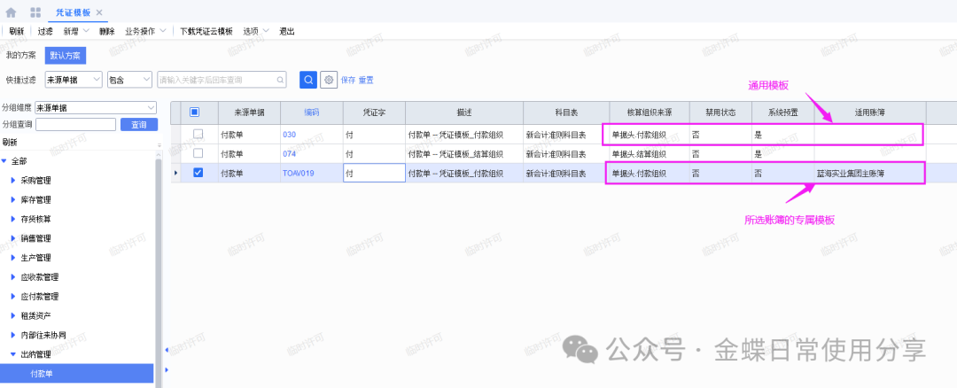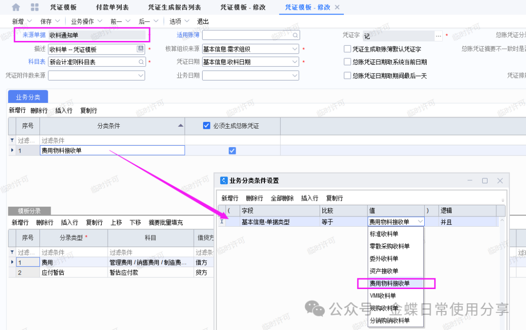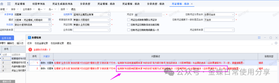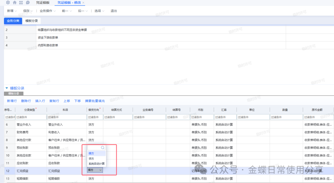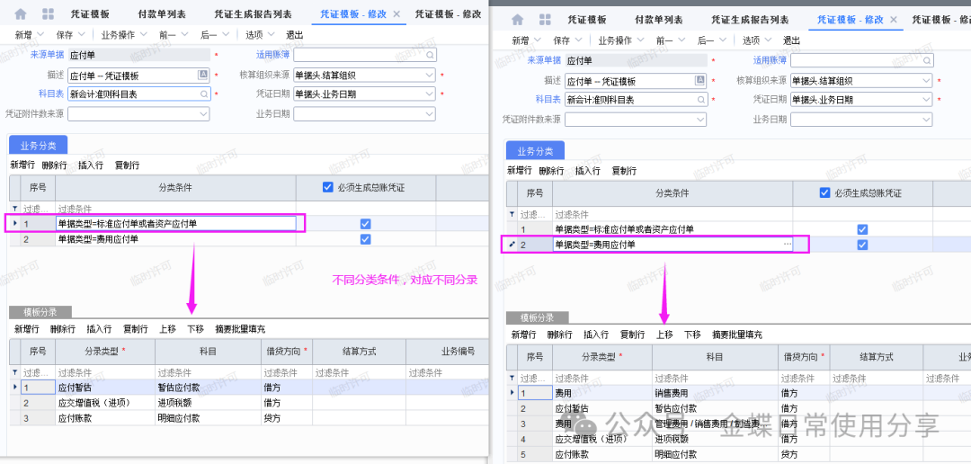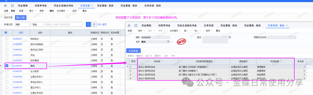 【概述】 業(yè)務(wù)模塊的單據(jù),根據(jù)憑證模板生成到總賬憑證。憑證模板用于設(shè)置憑證各要素的取值規(guī)則,如憑證日期、憑證字、摘要、科目、借貸方向及金額等。根據(jù)憑證模板配置,建立業(yè)務(wù)和財(cái)務(wù)的數(shù)據(jù)關(guān)聯(lián),實(shí)現(xiàn)業(yè)務(wù)財(cái)務(wù)一體化,保證賬務(wù)處理的質(zhì)量和效率。 【詳細(xì)說(shuō)明】 憑證模板的總體編制邏輯: 單據(jù)來(lái)源——適用賬簿——核算組織來(lái)源——分類條件——分錄生成條件——科目影響因素 憑證模板關(guān)鍵字段說(shuō)明如下: 1、適用賬簿 若適用賬簿為空,則表示為通用模版,所有組織所有賬簿都適用。若適用賬簿不為空,則表示僅指定賬簿的個(gè)性化模版(因?yàn)椴煌姆止究赡軜I(yè)務(wù)流程不一樣,需要單獨(dú)設(shè)置)。生成憑證的順序是先讀取個(gè)性化模版,再讀取通用模版。 2、業(yè)務(wù)分類 ① 可以理解為對(duì)單據(jù)的業(yè)務(wù)細(xì)分,不同的業(yè)務(wù)分類可以設(shè)置不同的模板分錄。單據(jù)上的表頭字段均可以作為業(yè)務(wù)分類的判斷依據(jù)(注意不僅僅是單據(jù)類型字段)。通過(guò)業(yè)務(wù)分類,可以覆蓋一種來(lái)源單據(jù)承載的多種應(yīng)用場(chǎng)景。 ② 舉例說(shuō)明:應(yīng)付單有兩個(gè)單據(jù)類型——標(biāo)準(zhǔn)應(yīng)付和費(fèi)用應(yīng)付,兩種單據(jù)類型賬務(wù)處理不同,那么在設(shè)置憑證模板時(shí)應(yīng)該設(shè)置兩個(gè)業(yè)務(wù)分類,一個(gè)業(yè)務(wù)分類的單據(jù)類型=標(biāo)準(zhǔn)應(yīng)付,一個(gè)業(yè)務(wù)分類的單據(jù)類型=費(fèi)用應(yīng)付,兩個(gè)業(yè)務(wù)分類所對(duì)應(yīng)的模板分錄是不同的。單據(jù)生成憑證時(shí)系統(tǒng)會(huì)自動(dòng)判斷滿足哪個(gè)業(yè)務(wù)分類從而生成對(duì)應(yīng)的分錄。